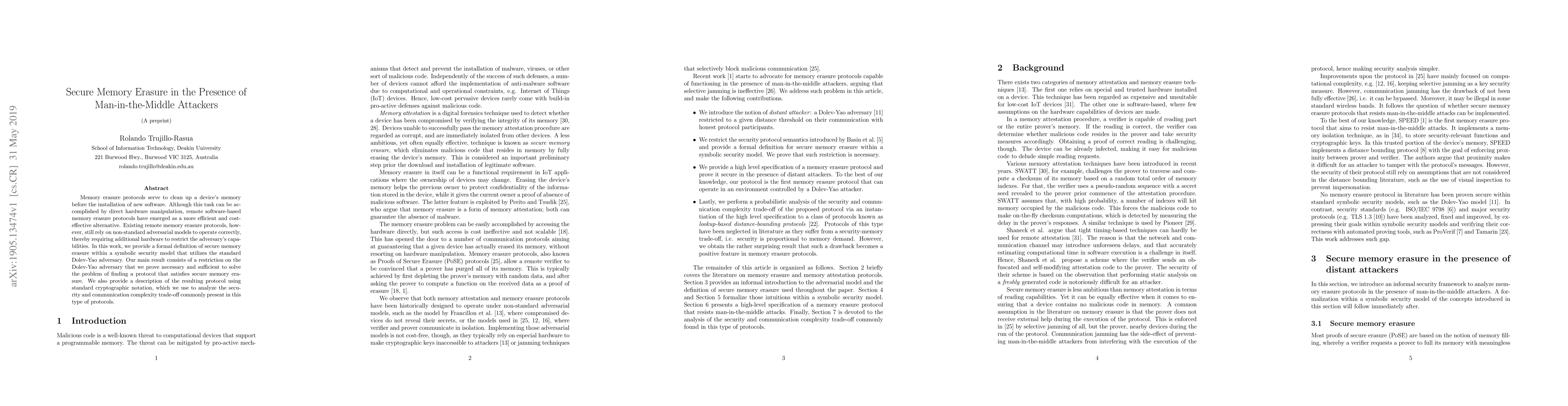 Memory erasure protocols serve to clean up a device's memory before the installation of new software. Although this task can be accomplished by direct hardware manipulation, remote software-based memory erasure protocols have emerged as a more efficient and cost-effective alternative. Existing remote memory erasure protocols, however, still rely on non-standard adversarial models to operate correctly, thereby requiring additional hardware to restrict the adversary's capabilities. In this work, we provide a formal definition of secure memory erasure within a symbolic security model that utilizes the standard Dolev-Yao adversary. Our main result consists of a restriction on the Dolev-Yao adversary that we prove necessary and sufficient to solve the problem of finding a protocol that satisfies secure memory erasure. We also provide a description of the resulting protocol using standard cryptographic notation, which we use to analyze the security and communication complexity trade-off commonly present in this type of protocols.