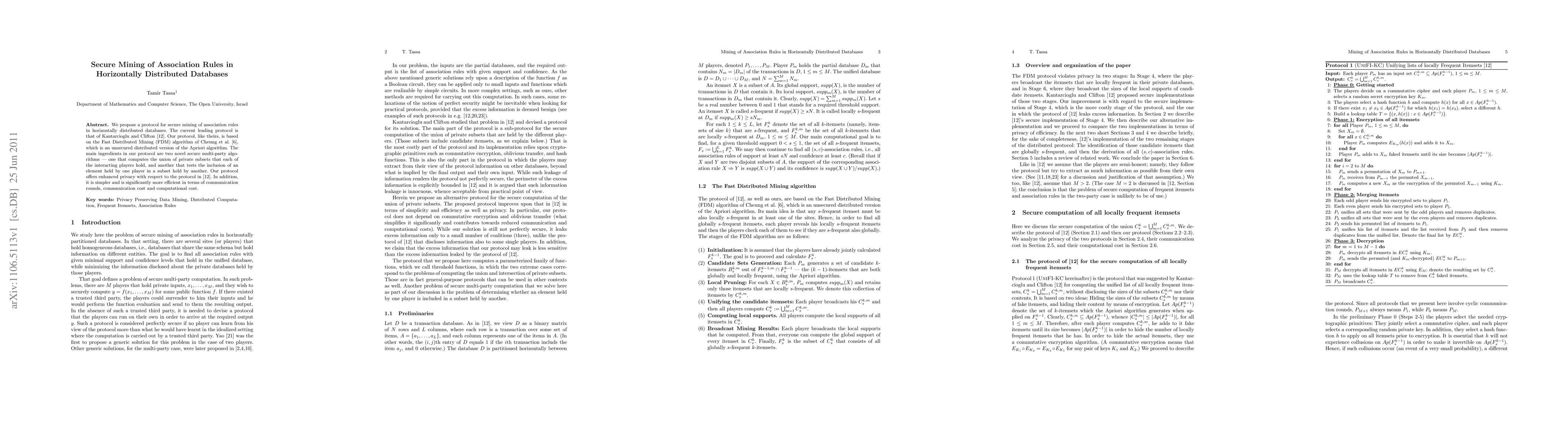 We propose a protocol for secure mining of association rules in horizontally distributed databases. The current leading protocol is that of Kantarcioglu and Clifton (TKDE 2004). Our protocol, like theirs, is based on the Fast Distributed Mining (FDM) algorithm of Cheung et al. (PDIS 1996), which is an unsecured distributed version of the Apriori algorithm. The main ingredients in our protocol are two novel secure multi-party algorithms --- one that computes the union of private subsets that each of the interacting players hold, and another that tests the inclusion of an element held by one player in a subset held by another. Our protocol offers enhanced privacy with respect to the protocol of Kantarcioglu and Clifton. In addition, it is simpler and is significantly more efficient in terms of communication rounds, communication cost and computational cost.