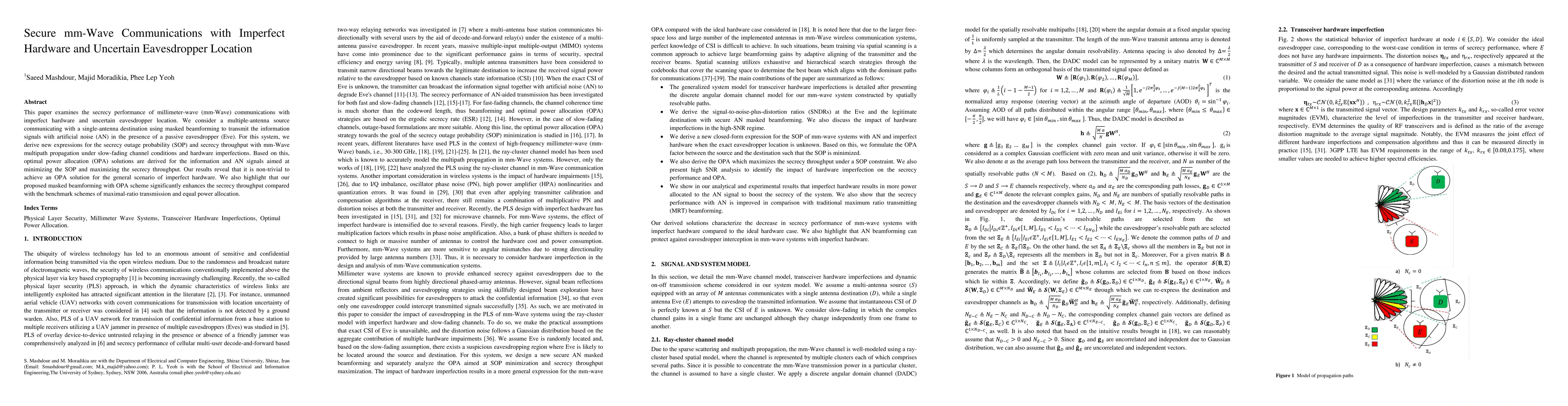 This paper examines the secrecy performance of millimeter-wave (mm-Wave) communications with imperfect hardware and uncertain eavesdropper location. We consider a multiple-antenna source communicating with a single-antenna destination using masked beamforming to transmit the information signals with artificial noise (AN) in the presence of a passive eavesdropper (Eve). For this system, we derive new expressions for the secrecy outage probability (SOP) and secrecy throughput with mm-Wave multipath propagation under slow-fading channel conditions and hardware imperfections. Based on this, optimal power allocation (OPA) solutions are derived for the information and AN signals aimed at minimizing the SOP and maximizing the secrecy throughput. Our results reveal that it is non-trivial to achieve an OPA solution for the general scenario of imperfect hardware. We also highlight that our proposed masked beamforming with OPA scheme significantly enhances the secrecy throughput compared with the benchmark schemes of maximal-ratio transmission and equal power allocation.