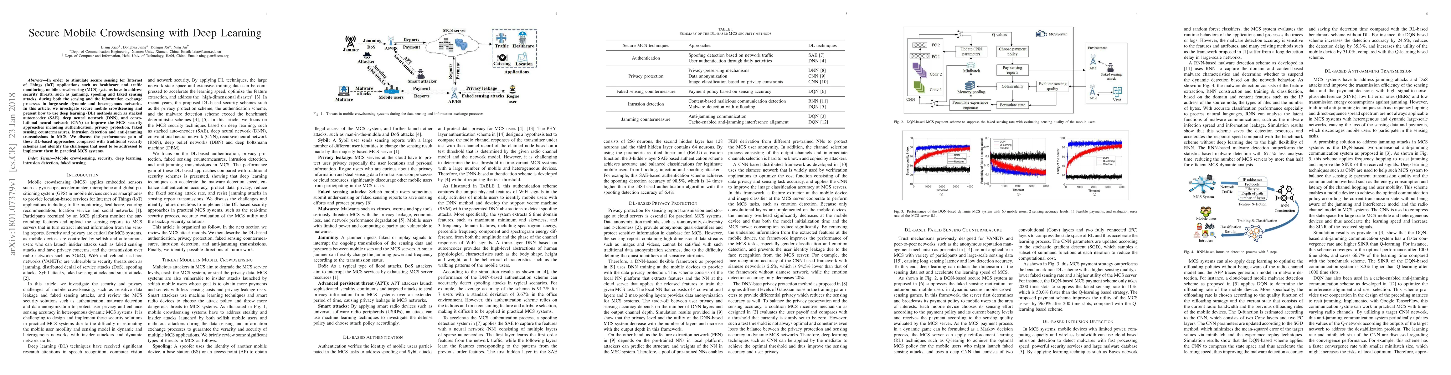 This paper explores secure mobile crowdsensing (MCS) for IoT applications using deep learning methods like SAE, DNN, and CNN to enhance security against threats like jamming and spoofing. It evaluates the performance benefits of these approaches over traditional security schemes and highlights practical challenges for implementation.