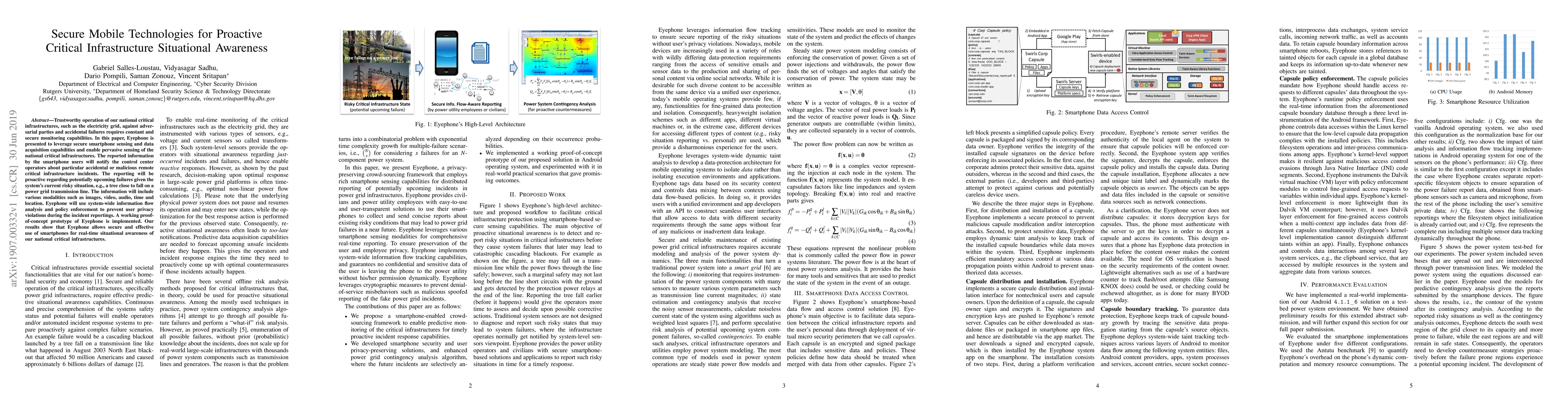This paper introduces Eyephone, a secure mobile technology leveraging smartphone sensing to provide real-time situational awareness for national critical infrastructures. The system collects and reports various data modalities to notify operators of potential incidents, ensuring privacy through policy enforcement.