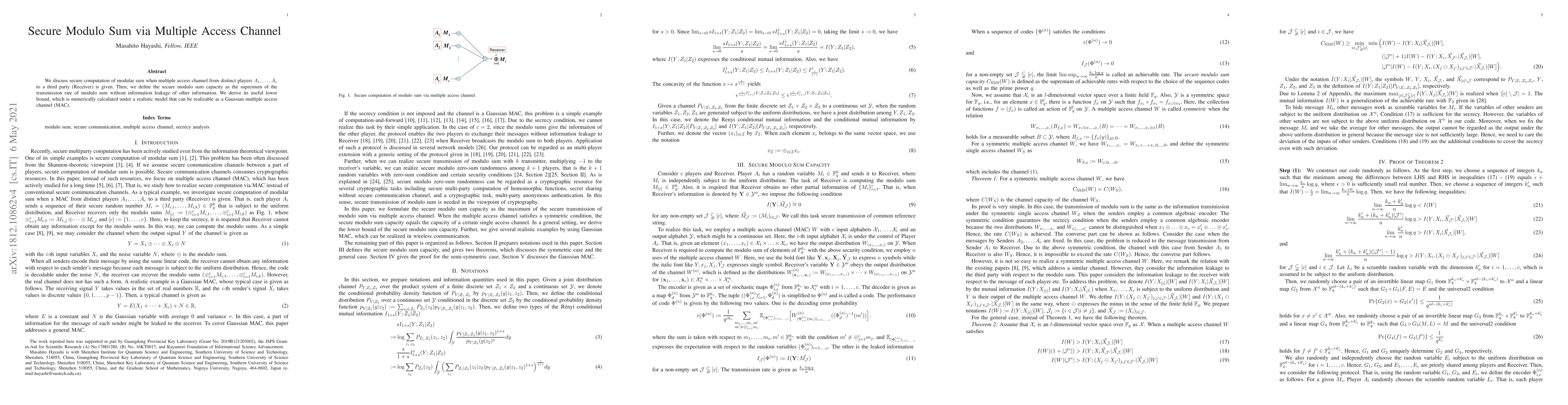 We discuss secure computation of modular sum when multiple access channel from distinct players $A_1, \ldots, A_c$ to a third party (Receiver) is given. Then, we define the secure modulo sum capacity as the supremum of the transmission rate of modulo sum without information leakage of other information. We derive its useful lower bound, which is numerically calculated under a realistic model that can be realizable as a Gaussian multiple access channel (MAC).