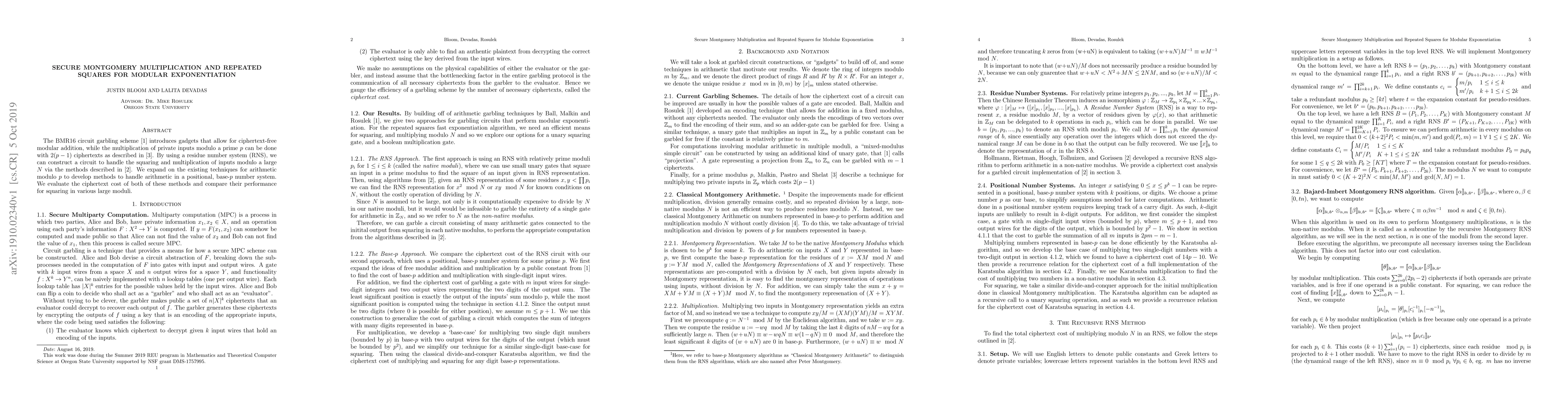 The BMR16 circuit garbling scheme introduces gadgets that allow for ciphertext-free modular addition, while the multiplication of private inputs modulo a prime p can be done with 2(p - 1) ciphertexts as described in Malkin, Pastro, and Shelat's An algebraic approach to garbling. By using a residue number system (RNS), we can construct a circuit to handle the squaring and multiplication of inputs modulo a large N via the methods described in Hollman and Gorissen's multi-layer residue number system. We expand on the existing techniques for arithmetic modulo p to develop methods to handle arithmetic in a positional, base-p number system. We evaluate the ciphertext cost of both of these methods and compare their performance for squaring in various large moduli.