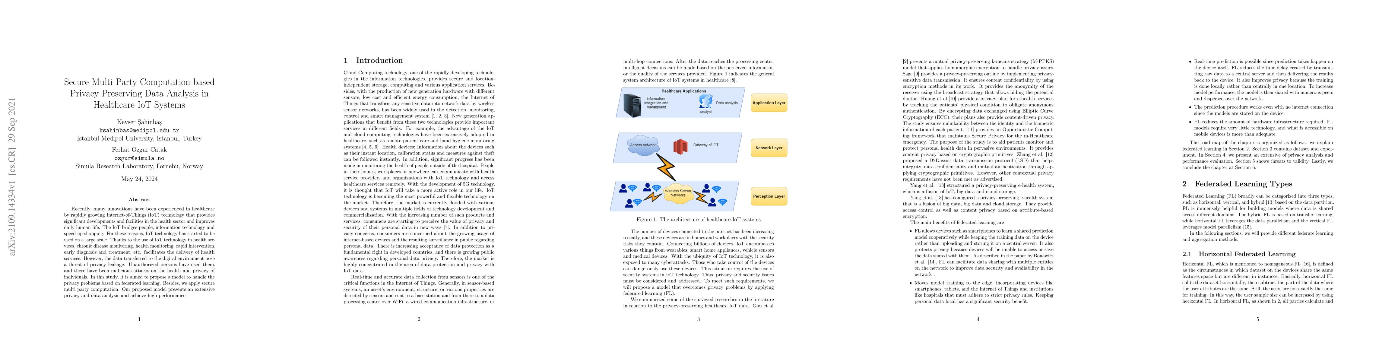 This paper proposes a privacy-preserving data analysis model for healthcare IoT systems using federated learning and secure multi-party computation to address privacy leakage issues, ensuring high performance and extensive data protection.