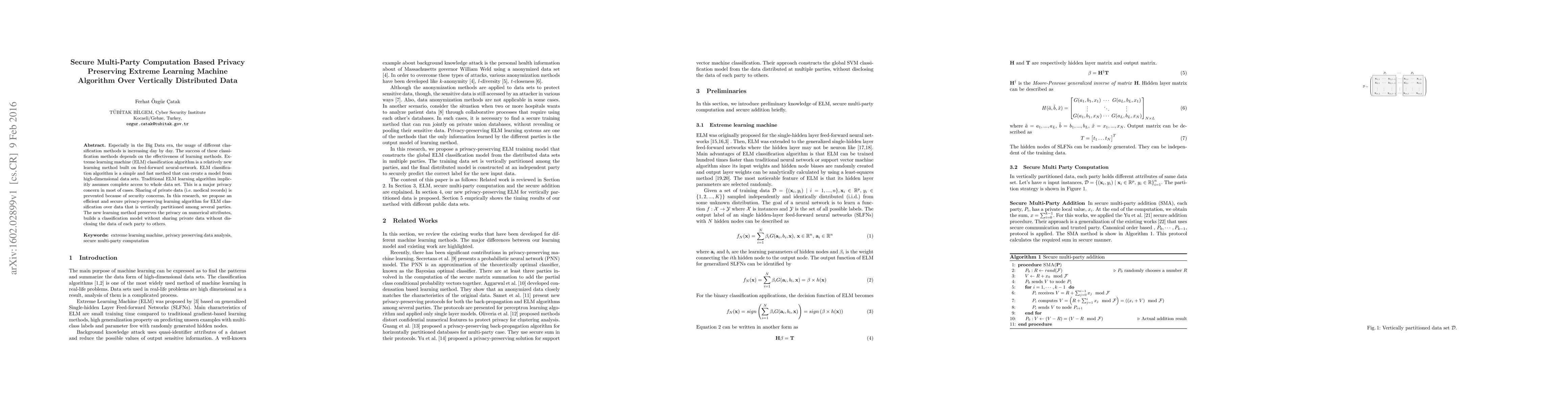 This paper proposes a secure multi-party computation method for privacy-preserving extreme learning machine (ELM) classification over vertically partitioned data. The new algorithm enables the construction of a classification model without sharing private data, addressing security concerns in data sharing.