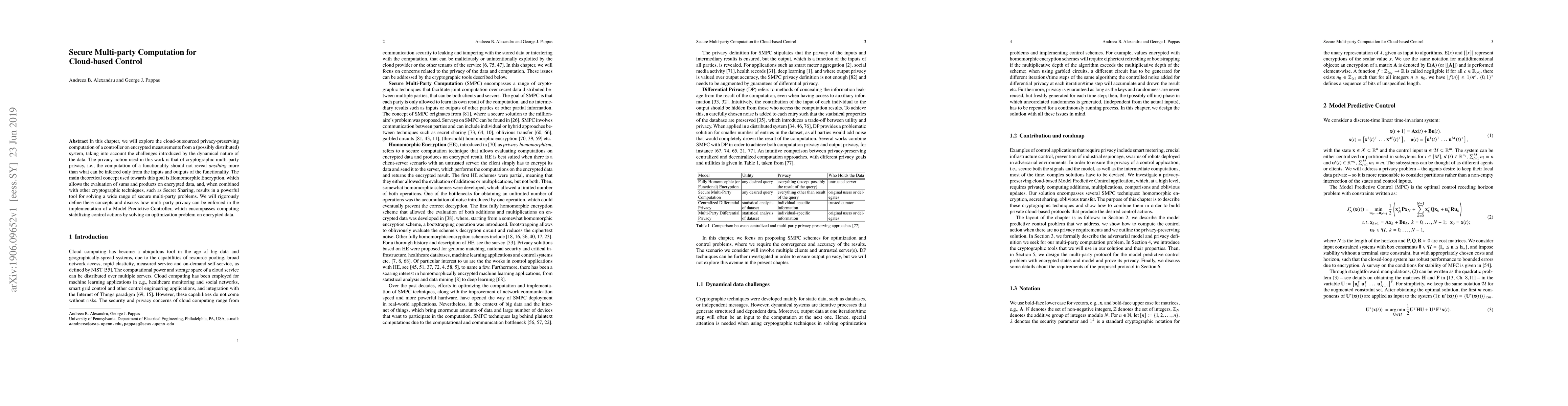 In this chapter, we will explore the cloud-outsourced privacy-preserving computation of a controller on encrypted measurements from a (possibly distributed) system, taking into account the challenges introduced by the dynamical nature of the data. The privacy notion used in this work is that of cryptographic multi-party privacy, i.e., the computation of a functionality should not reveal anything more than what can be inferred only from the inputs and outputs of the functionality. The main theoretical concept used towards this goal is Homomorphic Encryption, which allows the evaluation of sums and products on encrypted data, and, when combined with other cryptographic techniques, such as Secret Sharing, results in a powerful tool for solving a wide range of secure multi-party problems. We will rigorously define these concepts and discuss how multi-party privacy can be enforced in the implementation of a Model Predictive Controller, which encompasses computing stabilizing control actions by solving an optimization problem on encrypted data.