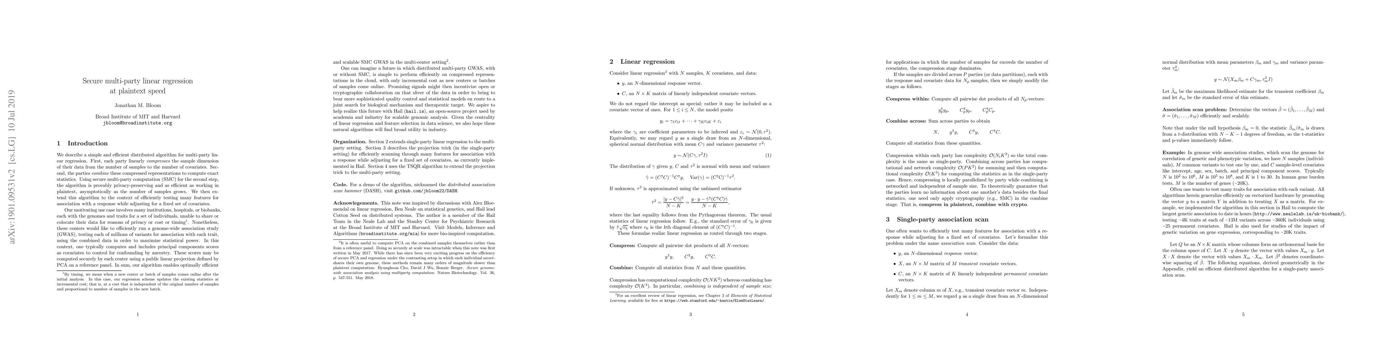 We detail distributed algorithms for scalable, secure multiparty linear regression and feature selection at essentially the same speed as plaintext regression. While the core geometric ideas are simple, the recognition of their broad utility when combined is novel. Our scheme opens the door to efficient and secure genome-wide association studies across multiple biobanks.