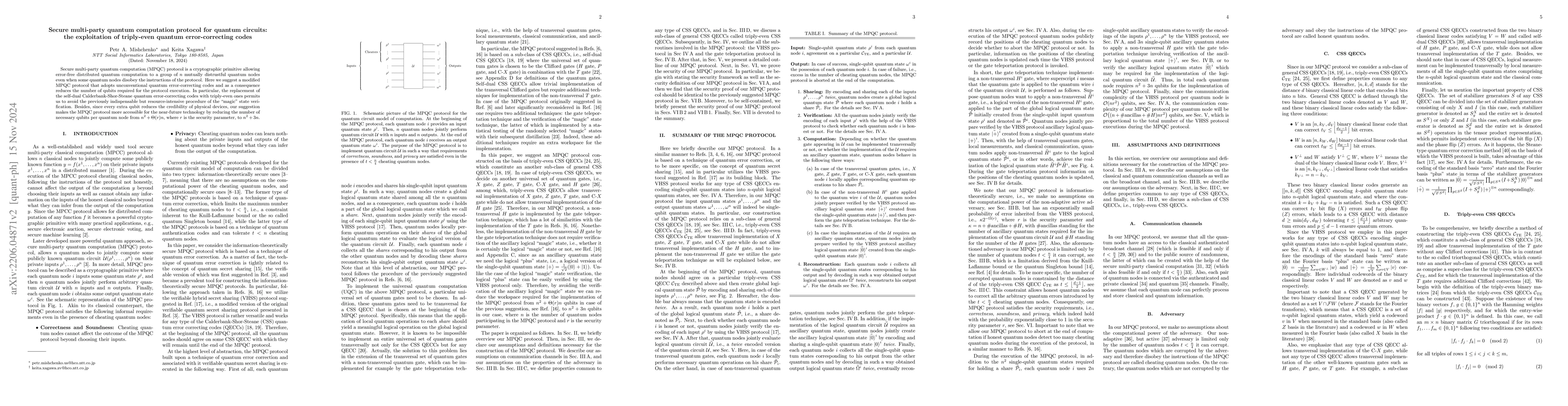 In this paper we suggest secure multi-party quantum computation (MPQC) protocol based on a sub-class of Chalderbank-Shor-Steane (CSS) quantum error-correcting codes (QECCs), i.e., triply-even CSS QECCs. In order to achieve universal quantum computation (UQC) in the MPQC protocol based on triply-even CSS QECCs, in addition to the set of trivially implemented transversal quantum gates, one needs to implement a non-transversal $H$ gate, which can be accomplished by the gate teleportation technique with the logical ``plus'' state as an ancillary quantum state. In comparison, to achieve UQC in the previously suggested MPQC protocol based on another sub-class of CSS QECCs, i.e., self-dual CSS QECCs, instead of non-transversal $H$ gate one needs to implement a non-transversal $T$ gate. It also can be realized by the gate teleportation technique but requires additional verification of the logical ``magic'' state, which is used as an ancillary quantum state. Verification of the logical ``magic'' state suggested in the previous study not only requires extra workspace for the implementation but also employs a non-transversal $\mathrm{C}\text{-}XP^\dag$ gate, which may lead to a failure of the entire MPQC protocol. By replacing self-dual CSS QECCs with triply-even CSS QECCs, for which $T$ gate becomes transversal, we avoid verification of the logical ``magic'' state. Consequently, our demand for workspace per quantum node is reduced from $n^2 + 4n$ qubits in the previous suggestion to $n^2 + 3n$ qubits in our current suggestion, where $n$ is the number of quantum nodes participating in the MPQC protocol.