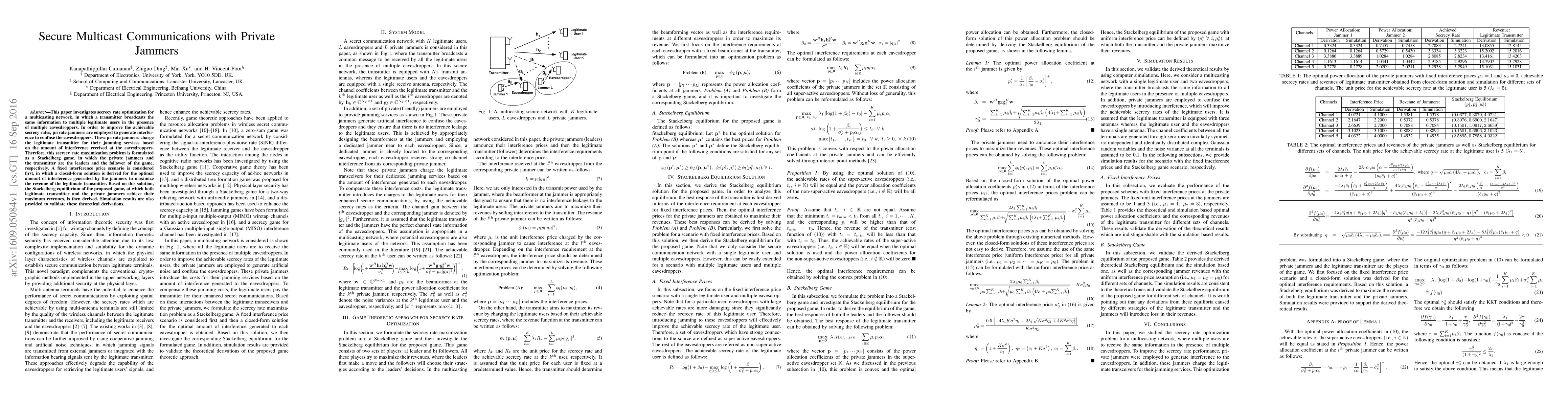 This paper investigates secrecy rate optimization for a multicasting network, in which a transmitter broadcasts the same information to multiple legitimate users in the presence of multiple eavesdroppers. In order to improve the achievable secrecy rates, private jammers are employed to generate interference to confuse the eavesdroppers. These private jammers charge the legitimate transmitter for their jamming services based on the amount of interference received at the eavesdroppers. Therefore, this secrecy rate maximization problem is formulated as a Stackelberg game, in which the private jammers and the transmitter are the leaders and the follower of the game, respectively. A fixed interference price scenario is considered first, in which a closed-form solution is derived for the optimal amount of interference generated by the jammers to maximize the revenue of the legitimate transmitter. Based on this solution, the Stackelberg equilibrium of the proposed game, at which both legitimate transmitter and the private jammers achieve their maximum revenues, is then derived. Simulation results are also provided to validate these theoretical derivations.