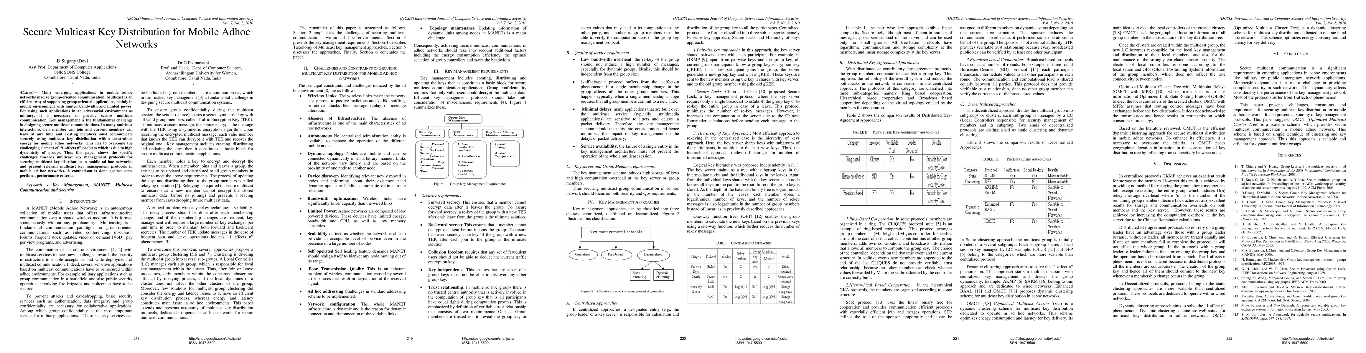 This paper discusses secure multicast key distribution for dynamic mobile ad hoc networks, emphasizing the challenges of frequent group membership changes and constrained energy. It presents multicast key management protocols and compares their performance based on relevant criteria.