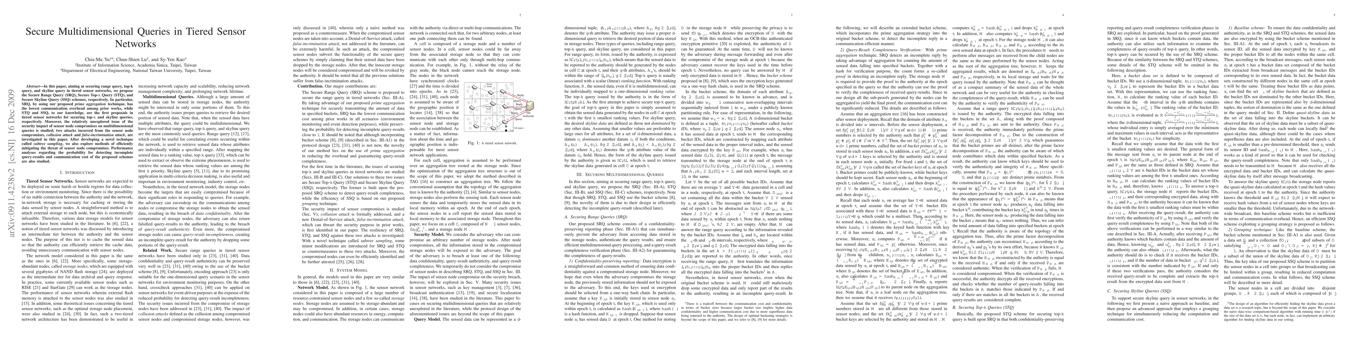 This paper proposes secure schemes for range, top-k, and skyline queries in tiered sensor networks, introducing prime aggregation for minimal communication overhead. It also investigates attacks from compromised nodes and presents mitigation techniques, analyzing performance in terms of detection probability and communication cost.