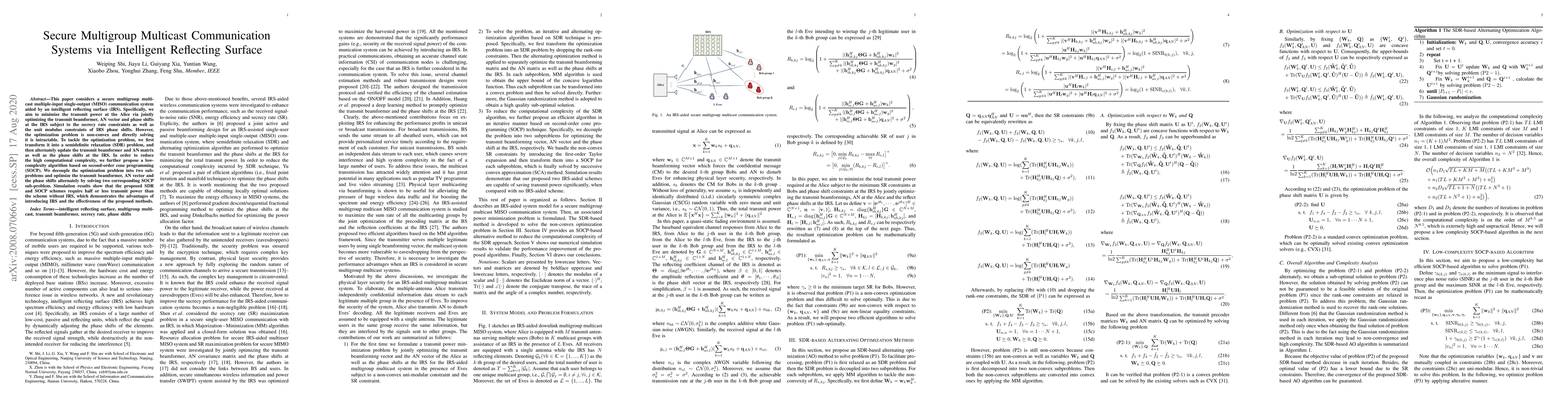This paper proposes a secure multigroup multicast communication system using an intelligent reflecting surface (IRS) to minimize Alice's transmit power while meeting secrecy rate constraints. The authors tackle the non-convex optimization problem through semidefinite relaxation and a low-complexity second-order cone programming algorithm, demonstrating significant power savings compared to systems without IRS.