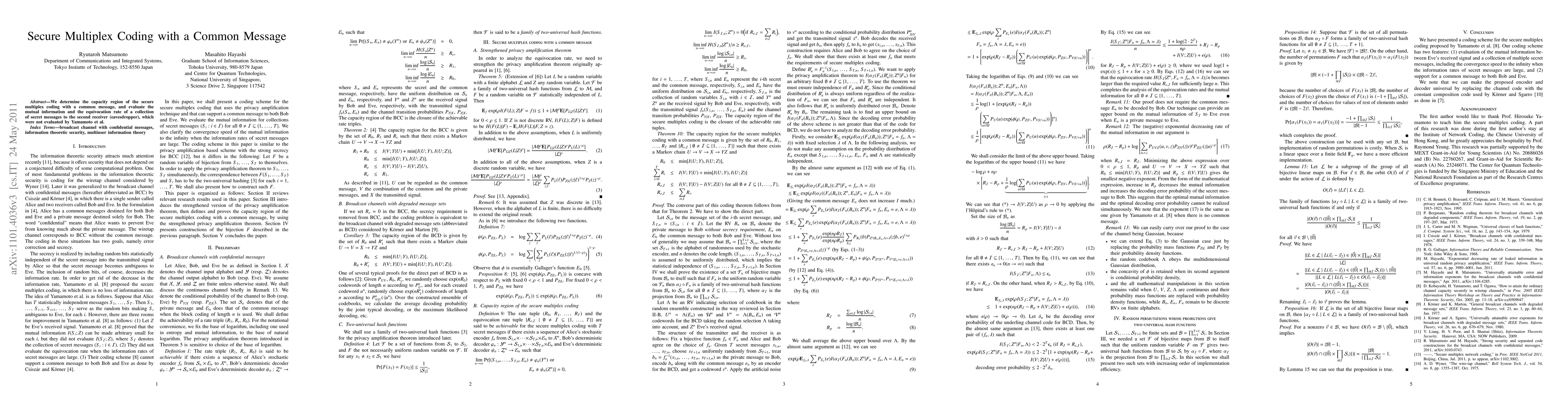 Summary: This paper establishes the capacity region for secure multiplex coding with a shared message and assesses mutual information and equivocation rates for secret messages to an eavesdropper, extending beyond previous evaluations by Yamamoto et al.