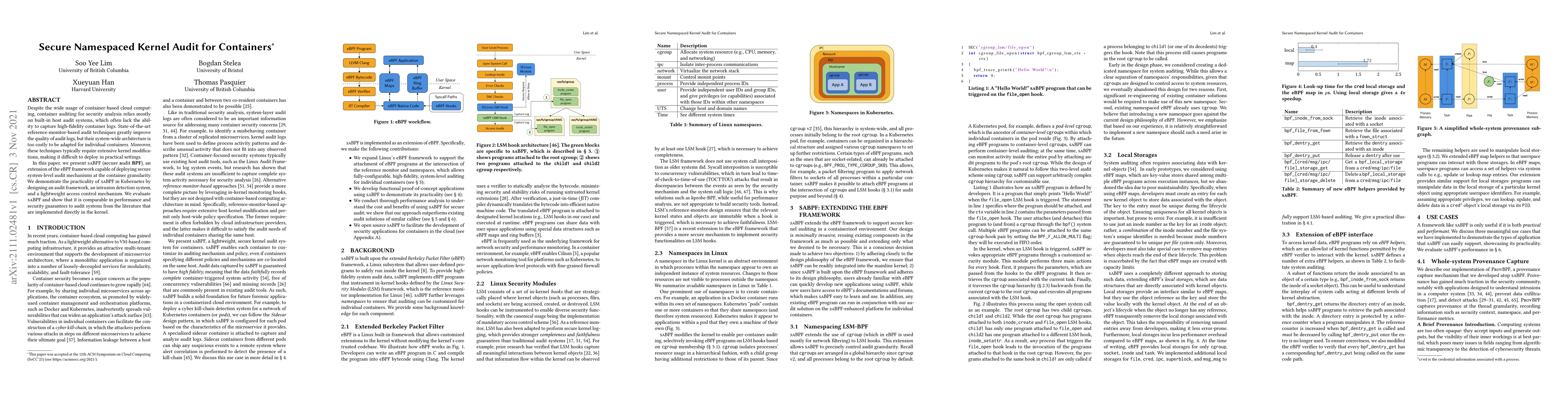 This paper introduces saBPF, an extension of the eBPF framework for secure container auditing, addressing the limitations of existing host-based audit systems. The proposed solution provides high-fidelity logs and lightweight access control, demonstrating practical deployment in Kubernetes without extensive kernel modifications.