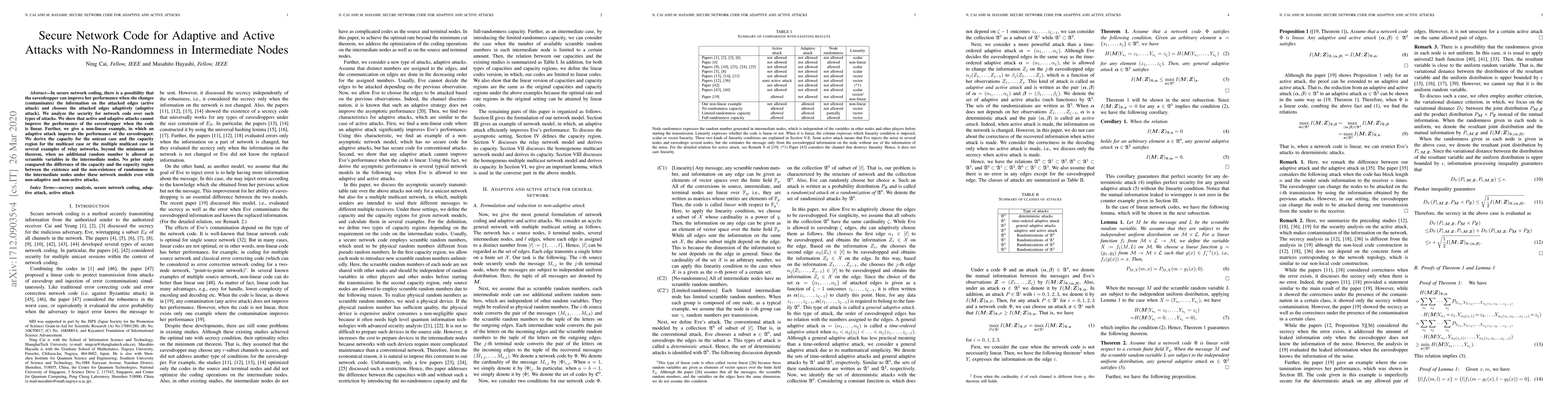 Researchers analyze network coding security under adaptive and active attacks with no randomness, finding that linear codes protect against such attacks but non-linear examples show improvements can occur. They also derive capacity formulas for unicast and multicast cases in relay networks.