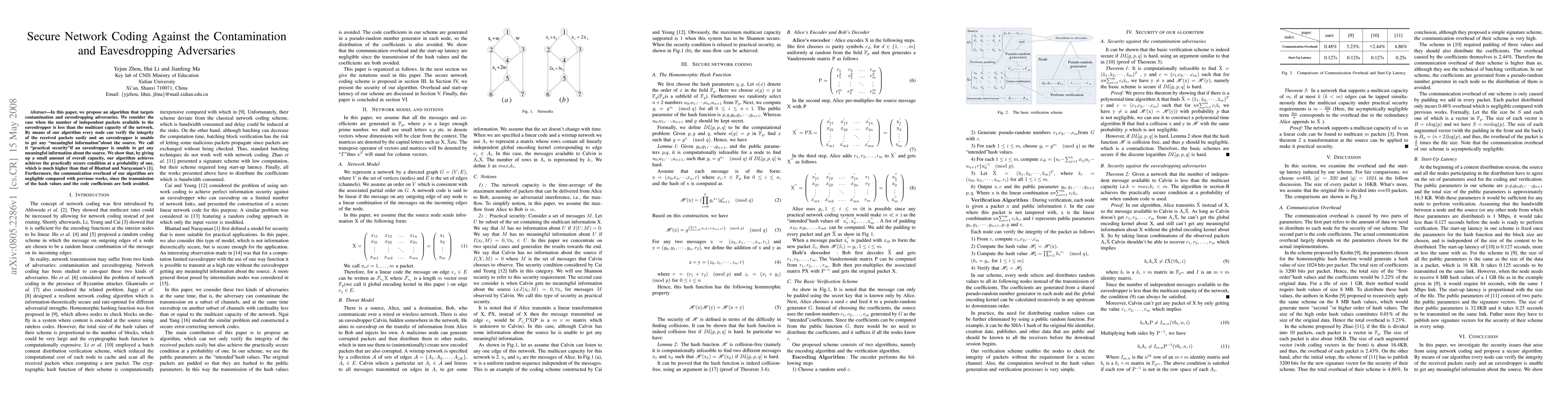 In this paper, we propose an algorithm that targets contamination and eavesdropping adversaries. We consider the case when the number of independent packets available to the eavesdropper is less than the multicast capacity of the network. By means of our algorithm every node can verify the integrity of the received packets easily and an eavesdropper is unable to get any meaningful information about the source. We call it practical security if an eavesdropper is unable to get any meaningful information about the source.We show that, by giving up a small amount of overall capacity, our algorithm achieves achieves the practically secure condition at a probability of one. Furthermore, the communication overhead of our algorithm are negligible compared with previous works, since the transmission of the hash values and the code coefficients are both avoided.