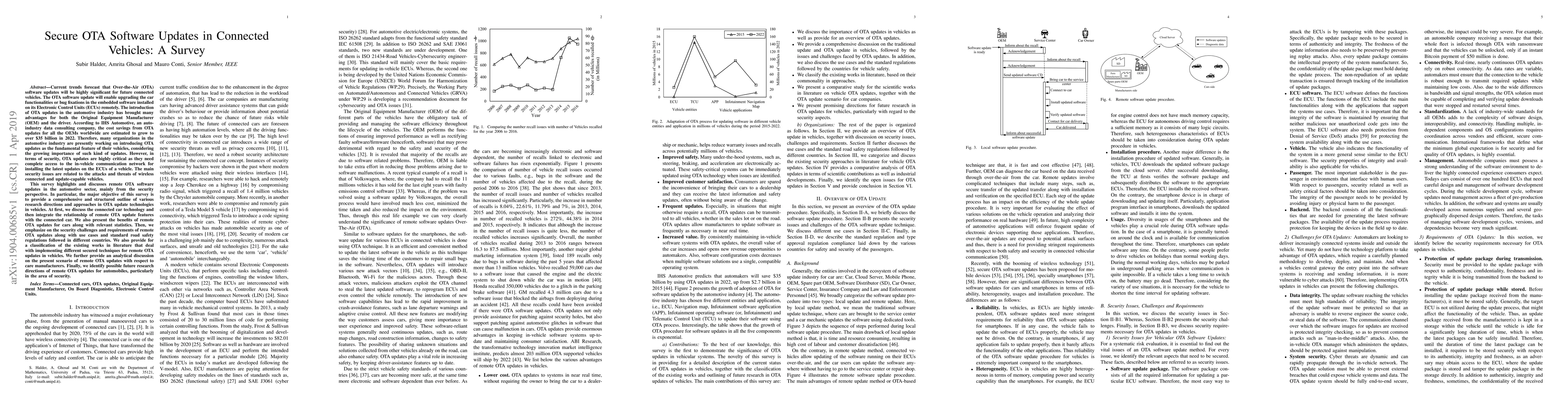 This survey provides a comprehensive overview of remote OTA software updates in connected vehicles, focusing on security challenges and requirements. It classifies existing research on secure OTA update techniques and identifies future research directions, particularly in automotive security.
