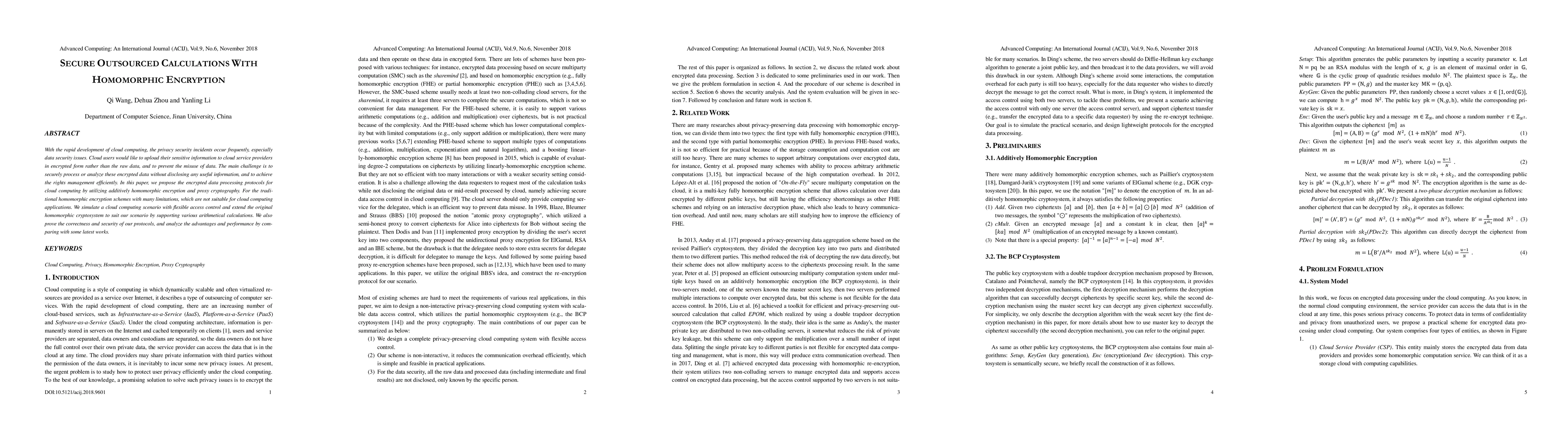 This paper proposes encrypted data processing protocols for cloud computing using additively homomorphic encryption and proxy cryptography to securely analyze encrypted data without disclosure. It extends traditional homomorphic encryption to suit flexible access control in cloud scenarios and demonstrates the correctness, security, and performance advantages over other methods.
