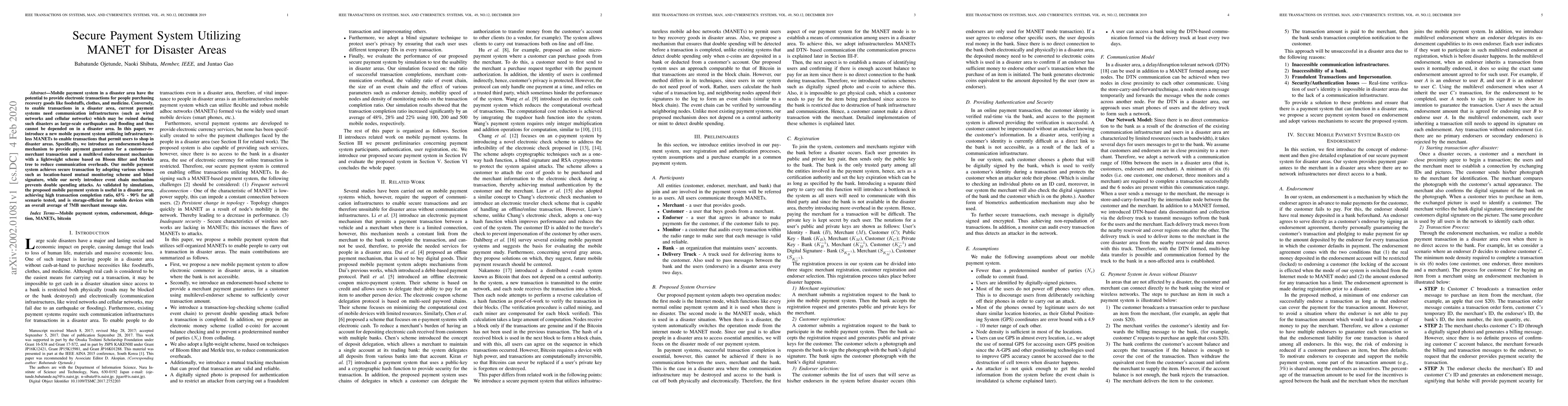 This paper proposes a secure mobile payment system using MANETs for disaster areas, enabling electronic transactions without relying on damaged communication infrastructures. It introduces an endorsement-based mechanism and a lightweight multilevel endorsement scheme to ensure secure and efficient transactions, achieving high transaction completion rates and low storage requirements.