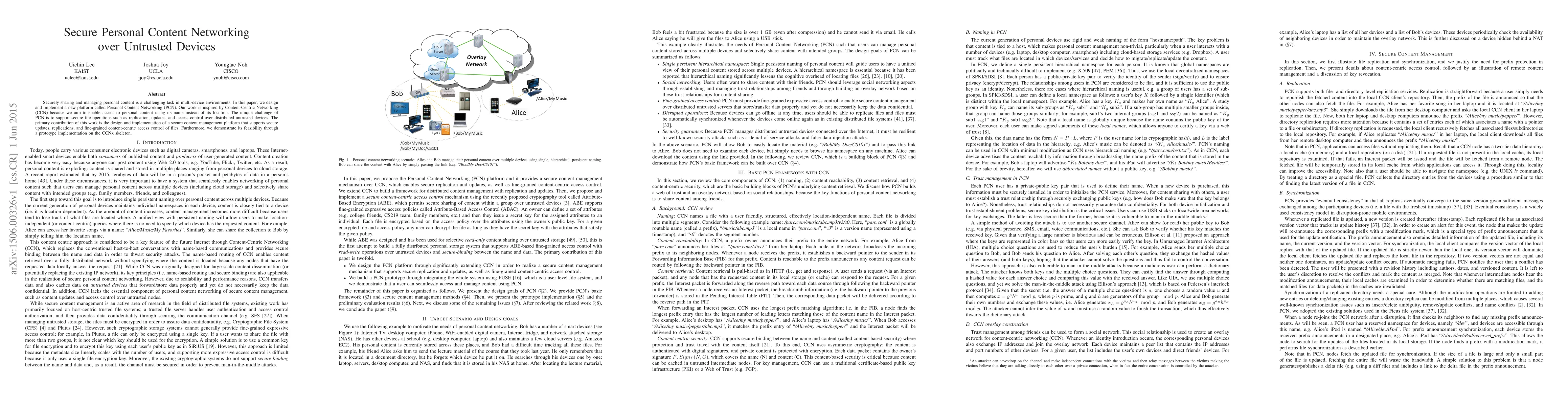 This paper introduces a secure Personal Content Networking (PCN) platform inspired by Content-Centric Networking (CCN), designed to manage personal content securely across untrusted devices. The platform supports secure file operations and fine-grained access control, demonstrated via a prototype implementation on CCNx.