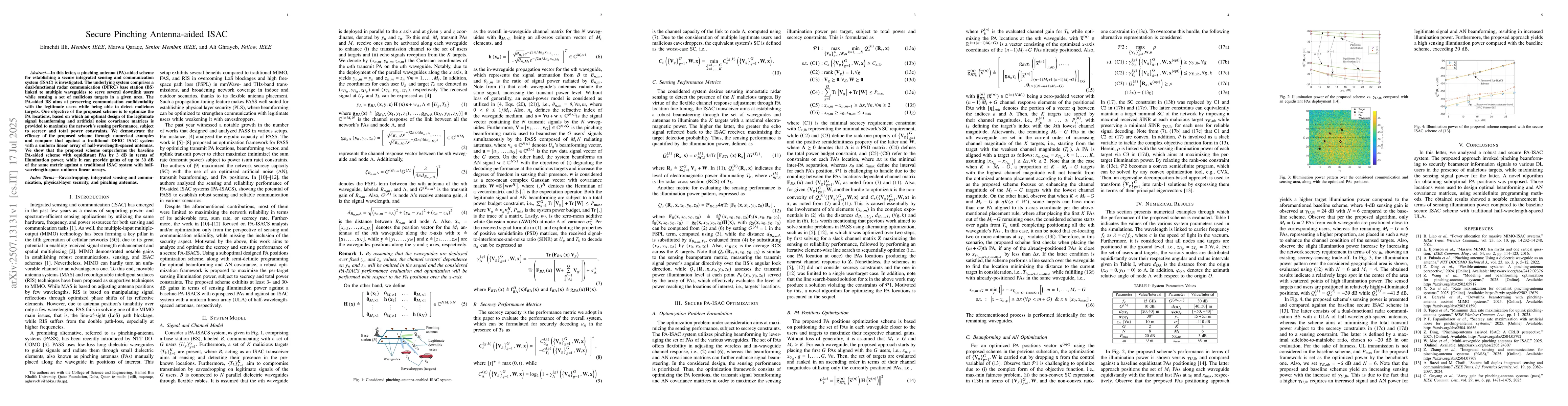 The research investigates a pinching antenna (PA)-aided scheme for establishing a secure integrated sensing and communication system (ISAC). It optimizes PA locations to design legitimate signal beamforming and artificial noise covariance matrices, maximizing sensing performance under secrecy and power constraints.