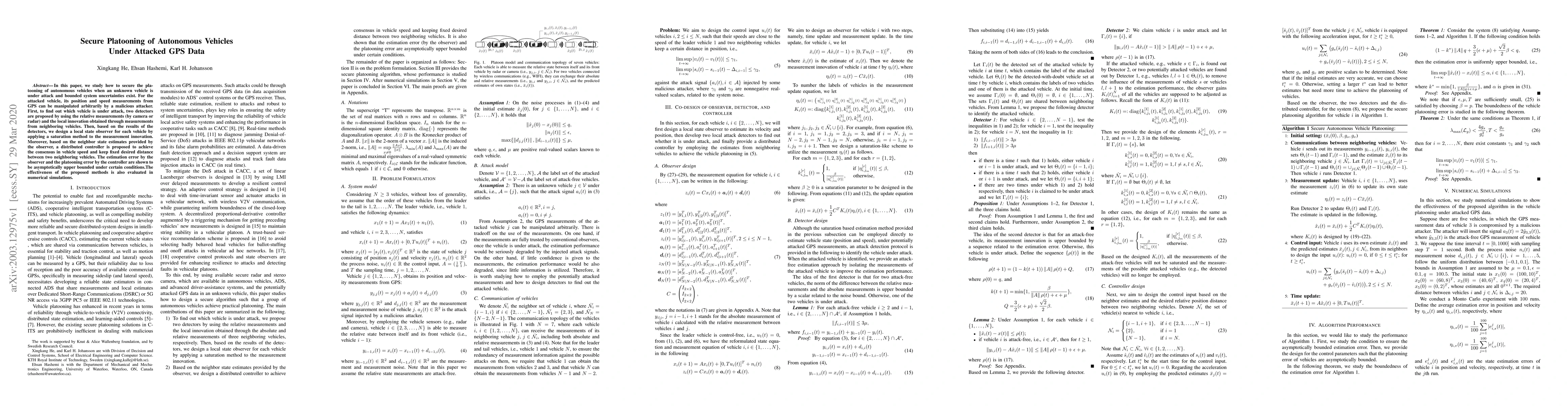 The paper presents a novel distributed control algorithm combining state estimation, attack detection, and consensus control for secure platooning under GPS spoofing attacks.
