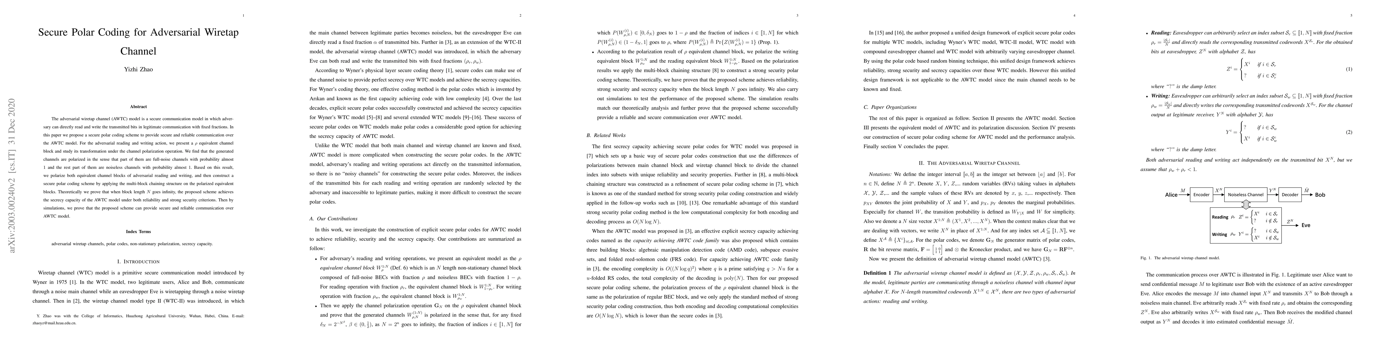 This paper proposes a secure polar coding scheme for the adversarial wiretap channel (AWTC) model, where an adversary can read and write transmitted bits. The authors introduce a $\rho$ equivalent channel block and demonstrate channel polarization, achieving full-noise and noiseless channels. The proposed scheme uses multi-block chaining for secure communication, theoretically proving it achieves secrecy capacity as block length approaches infinity and confirming its effectiveness through simulations.