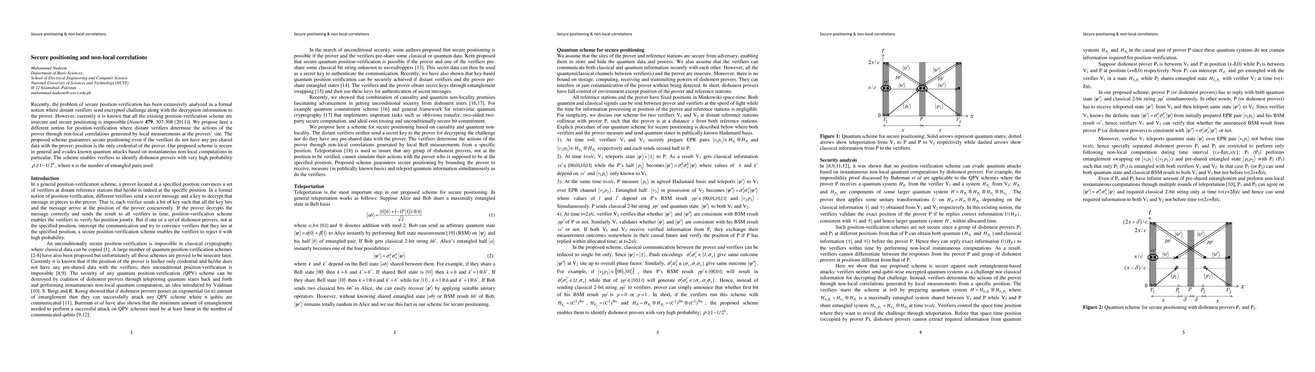 This paper proposes a novel secure positioning scheme using non-local correlations from local measurements, ensuring secure position verification without pre-shared data. The scheme is robust against quantum attacks and can effectively identify dishonest provers with high probability.