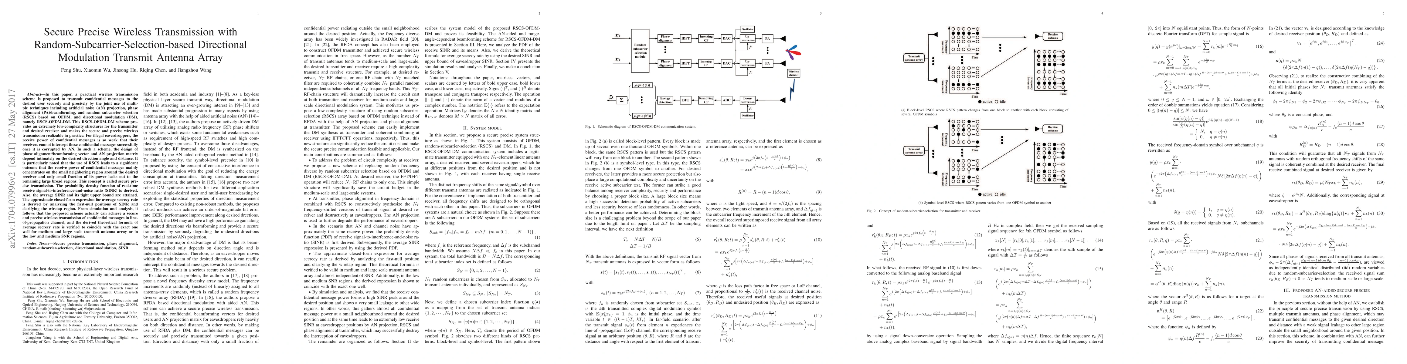 This paper proposes a secure and precise wireless transmission scheme using RSCS-OFDM-DM, combining artificial noise projection, phase alignment/beamforming, and random subcarrier selection. The method ensures low-complexity, secure transmission by focusing signal power on the intended receiver, while minimizing leakage to eavesdroppers.