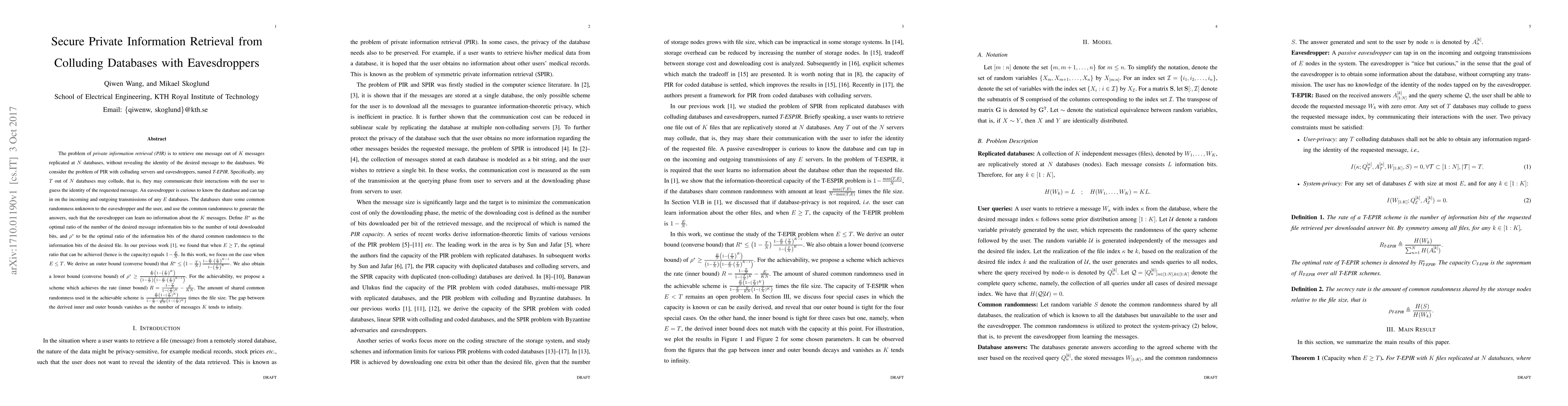 The problem of private information retrieval (PIR) is to retrieve one message out of $K$ messages replicated at $N$ databases, without revealing the identity of the desired message to the databases. We consider the problem of PIR with colluding servers and eavesdroppers, named T-EPIR. Specifically, any $T$ out of $N$ databases may collude, i.e. they may communicate their interactions with the user to guess the identity of the requested message. An eavesdropper is curious to know the database and can tap in on the incoming and outgoing transmissions of any $E$ databases. The databases share some common randomness unknown to the eavesdropper and the user, and use the common randomness to generate the answers, such that the eavesdropper can learn no information about the $K$ messages. Define $R^*$ as the optimal ratio of the number of the desired message information bits to the number of total downloaded bits, and $\rho^*$ to be the optimal ratio of the information bits of the shared common randomness to the information bits of the desired file. In our previous work, we found that when $E \geq T$, the optimal ratio that can be achieved equals $1-\frac{E}{N}$. In this work, we focus on the case when $E \leq T$. We derive an outer bound $R^* \leq (1-\frac{T}{N}) \frac{1-\frac{E}{N} \cdot (\frac{T}{N})^{K-1}}{1-(\frac{T}{N})^K}$. We also obtain a lower bound of $\rho^* \geq \frac{\frac{E}{N}(1-(\frac{T}{N})^K)}{(1-\frac{T}{N})(1-\frac{E}{N} \cdot (\frac{T}{N})^{K-1})}$. For the achievability, we propose a scheme which achieves the rate (inner bound) $R=\frac{1-\frac{T}{N}}{1-(\frac{T}{N})^K}-\frac{E}{KN}$. The amount of shared common randomness used in the achievable scheme is $\frac{\frac{E}{N}(1-(\frac{T}{N})^K)}{1-\frac{T}{N}-\frac{E}{KN}(1-(\frac{T}{N})^K)}$ times the file size. The gap between the derived inner and outer bounds vanishes as the number of messages $K$ tends to infinity.