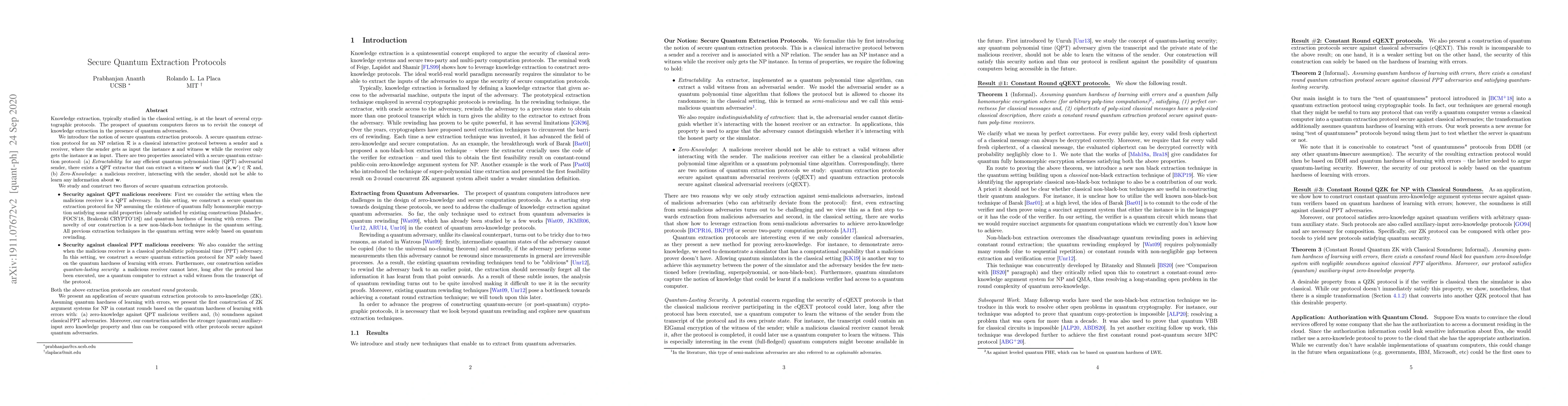 This paper introduces secure quantum extraction protocols, which allow a sender to extract a witness while ensuring that only the instance is revealed to a receiver. It constructs two types of protocols: one secure against quantum malicious receivers using quantum fully homomorphic encryption and another against classical malicious receivers using quantum hardness of learning with errors, and presents a constant round quantum zero-knowledge argument system for NP.