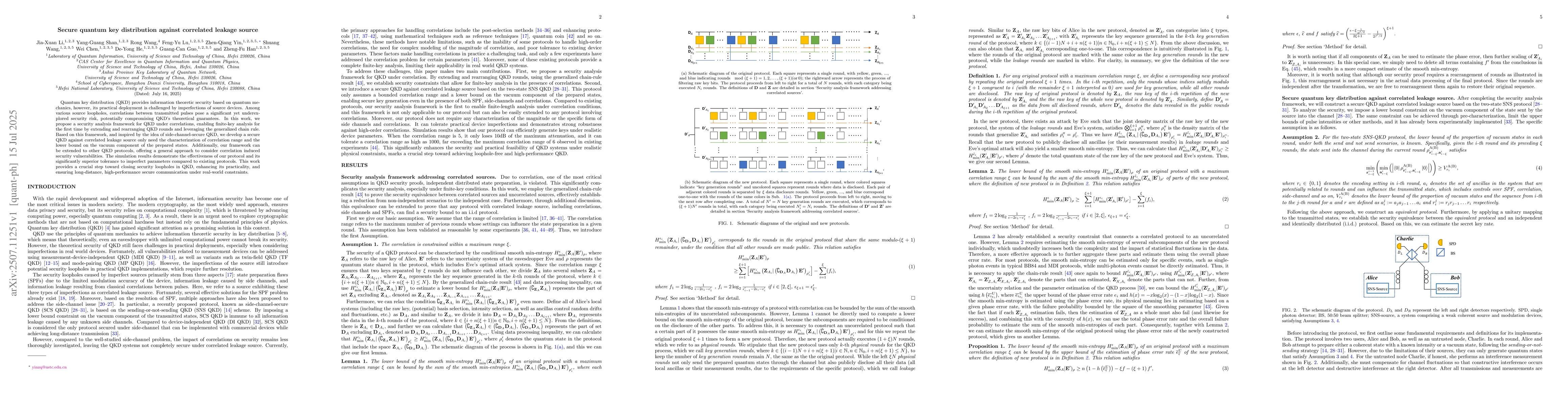 Quantum key distribution (QKD) provides information theoretic security based on quantum mechanics, however, its practical deployment is challenged by imperfections of source devices. Among various source loopholes, correlations between transmitted pulses pose a significant yet underexplored security risk, potentially compromising QKD's theoretical guarantees. In this work, we propose a security analysis framework for QKD under correlations, enabling finite-key analysis for the first time by extending and rearranging QKD rounds and leveraging the generalized chain rule. Based on this framework, and inspired by the idea of side-channel-secure QKD, we develop a secure QKD against correlated leakage source only need the characterization of correlation range and the lower bound on the vacuum component of the prepared states. Additionally, our framework can be extended to other QKD protocols, offering a general approach to consider correlation induced security vulnerabilities. The simulation results demonstrate the effectiveness of our protocol and its significantly superior tolerance to imperfect parameters compared to existing protocols. This work provides a crucial step toward closing security loopholes in QKD, enhancing its practicality, and ensuring long-distance,high-performance secure communication under real-world constraints.