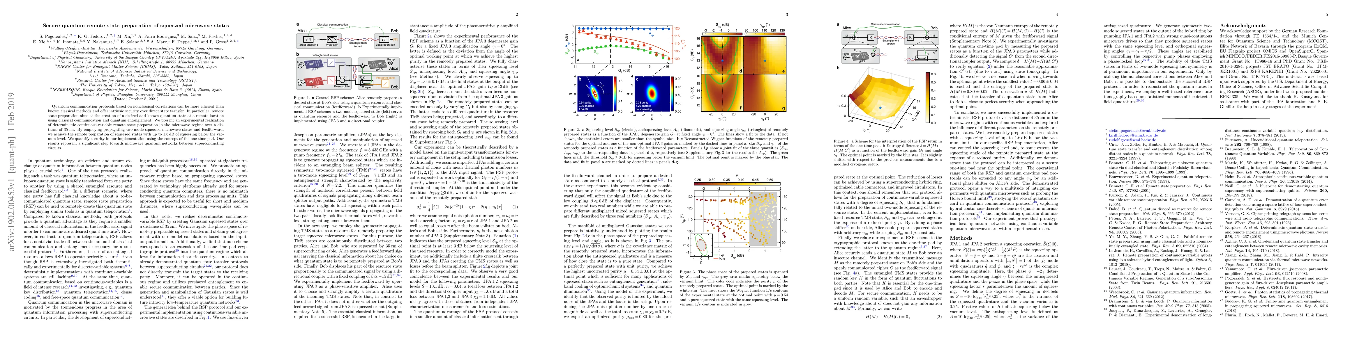 This paper details an experimental realization of secure, deterministic remote state preparation of squeezed microwave states over a 35 cm distance using propagating two-mode squeezed states and feedforward. The achieved squeezing of up to 1.6 dB below vacuum level demonstrates the potential for secure quantum communication in microwave quantum networks.