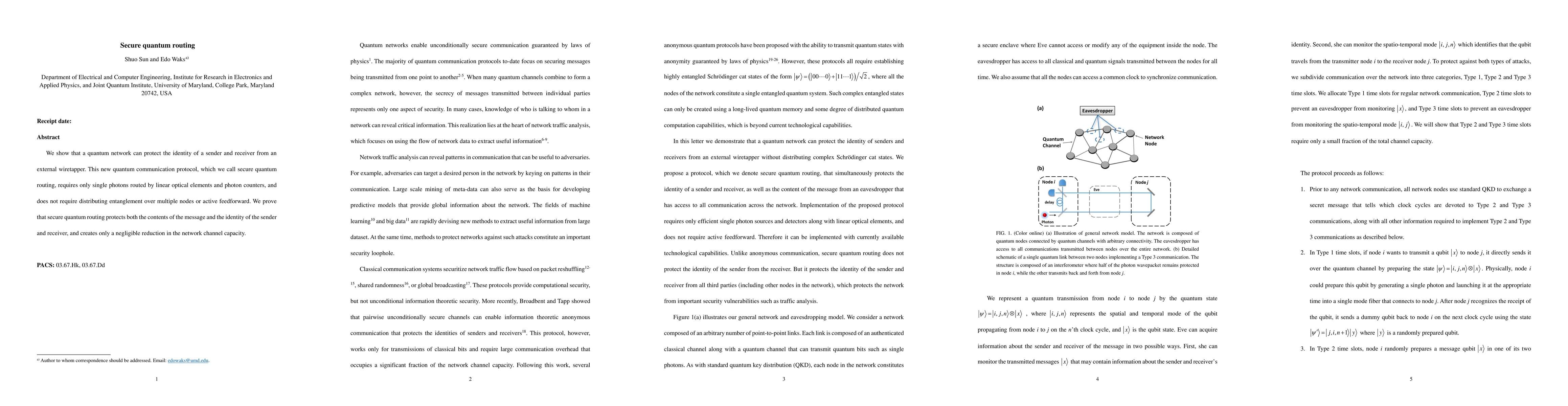 We show that a quantum network can protect the identity of a sender and receiver from an external wiretapper. This new quantum communication protocol, which we call secure quantum routing, requires only single photons routed by linear optical elements and photon counters, and does not require distributing entanglement over multiple nodes or active feedforward. We prove that secure quantum routing protects both the contents of the message and the identity of the sender and receiver, and creates only a negligible reduction in the network channel capacity.