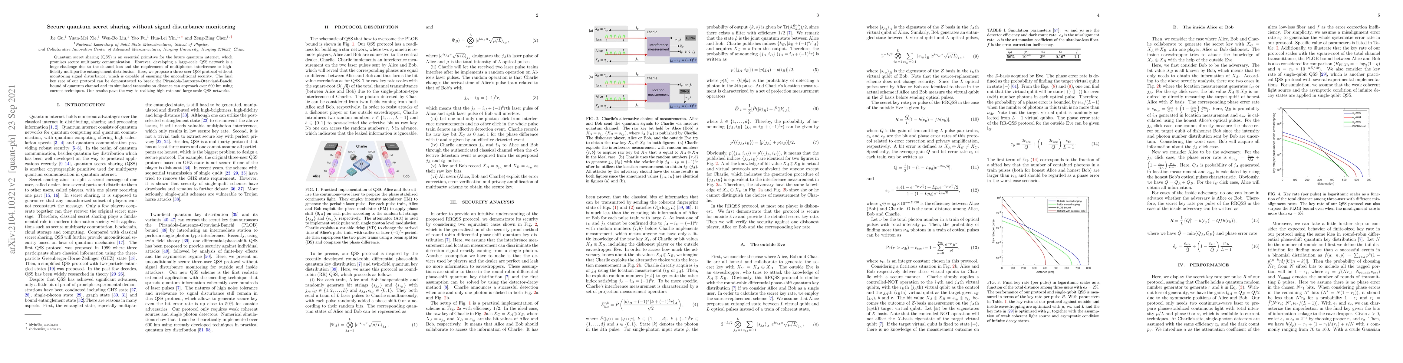 This paper proposes a secure three-user quantum secret sharing protocol that does not require monitoring signal disturbance, ensuring unconditional security. The protocol's final key rate surpasses existing quantum channel bounds, and its simulated transmission distance exceeds 600 km, facilitating the development of large-scale QSS networks.