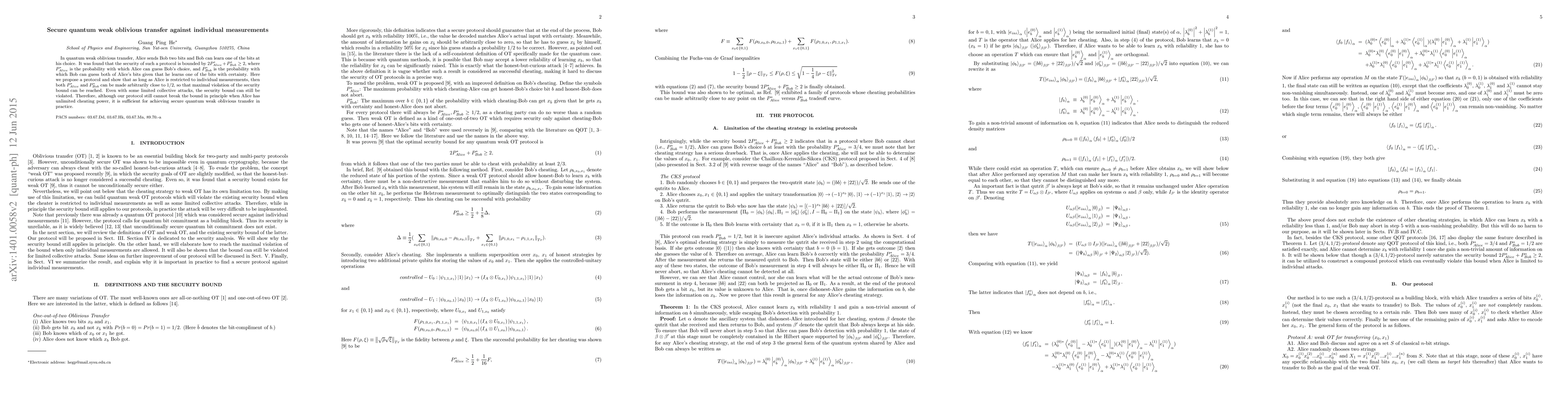 This paper proposes a protocol for secure quantum weak oblivious transfer where Alice sends Bob two bits, and Bob learns one at his choice. The protocol ensures that both Alice's and Bob's guessing probabilities can be made close to 1/2, thus maximally violating the security bound, demonstrating practical security despite theoretical limitations.