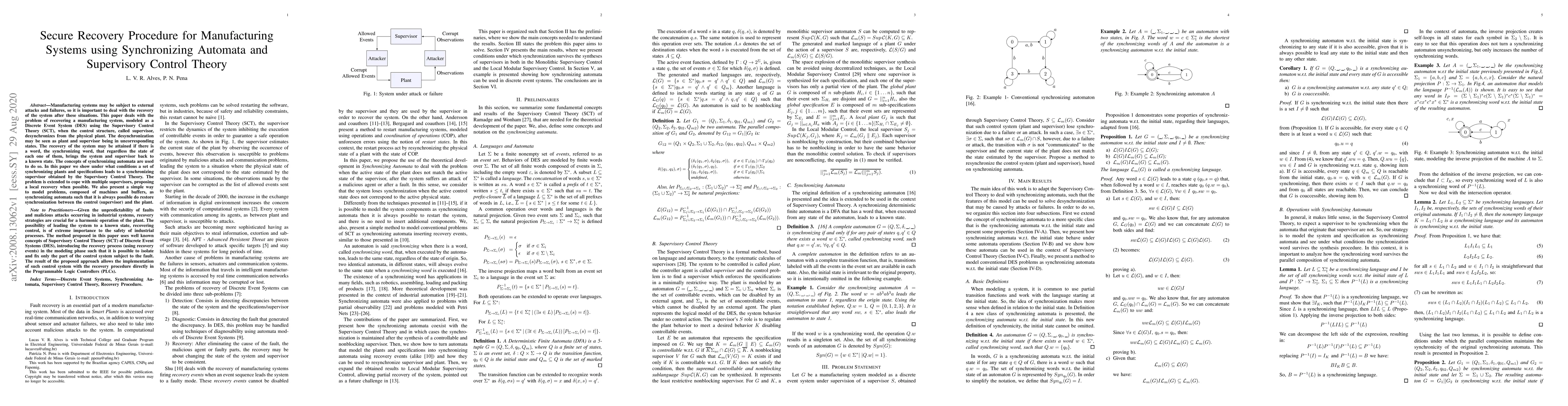 This paper proposes a secure recovery procedure for manufacturing systems using synchronizing automata and Supervisory Control Theory to address desynchronization after attacks or failures. It explores the conditions under which a synchronizing supervisor can be obtained, and extends the approach to handle multiple supervisors for local recovery.