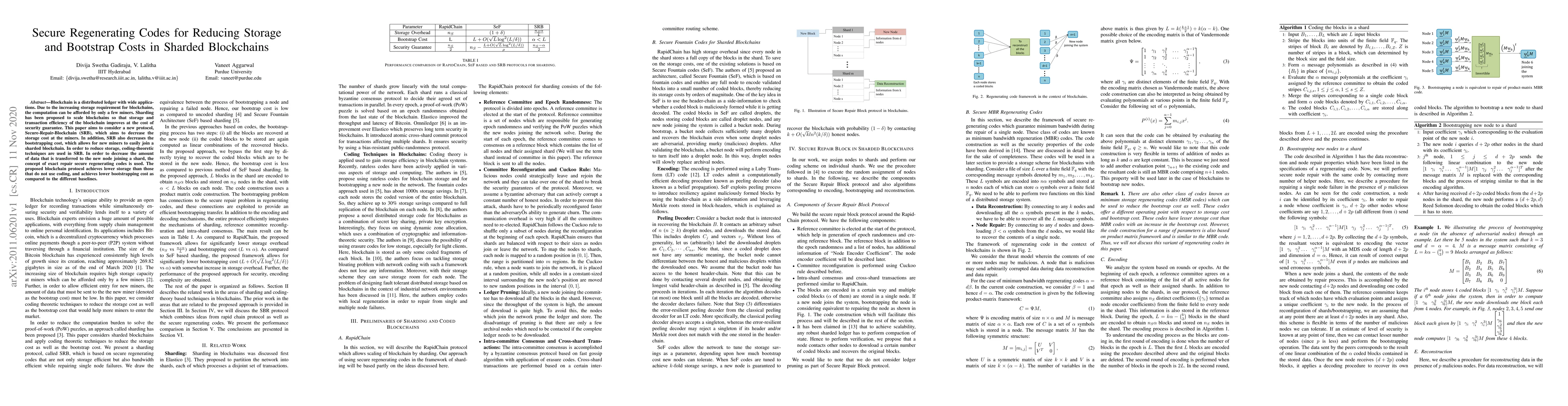 This paper introduces Secure-Repair-Blockchain (SRB), a protocol that uses coding-theoretic techniques to reduce storage and bootstrapping costs in sharded blockchains, leveraging exact repair secure regenerating codes to facilitate efficient data transfer for new nodes. SRB achieves lower storage and bootstrapping costs compared to baseline methods.