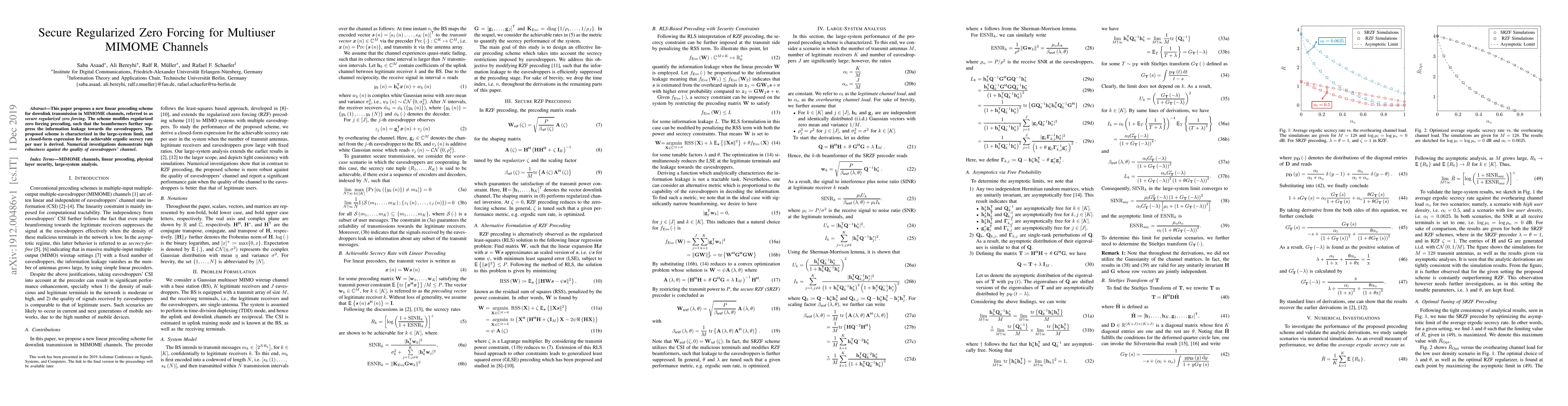 This paper proposes a new linear precoding scheme for downlink transmission in MIMOME channels, referred to as secure regularized zero forcing. The scheme modifies regularized zero forcing precoding, such that the beamformers further suppress the information leakage towards the eavesdroppers. The proposed scheme is characterized in the large-system limit, and a closed-form expression for the achievable ergodic secrecy rate per user is derived. Numerical investigations demonstrate high robustness against the quality of eavesdroppers' channel.