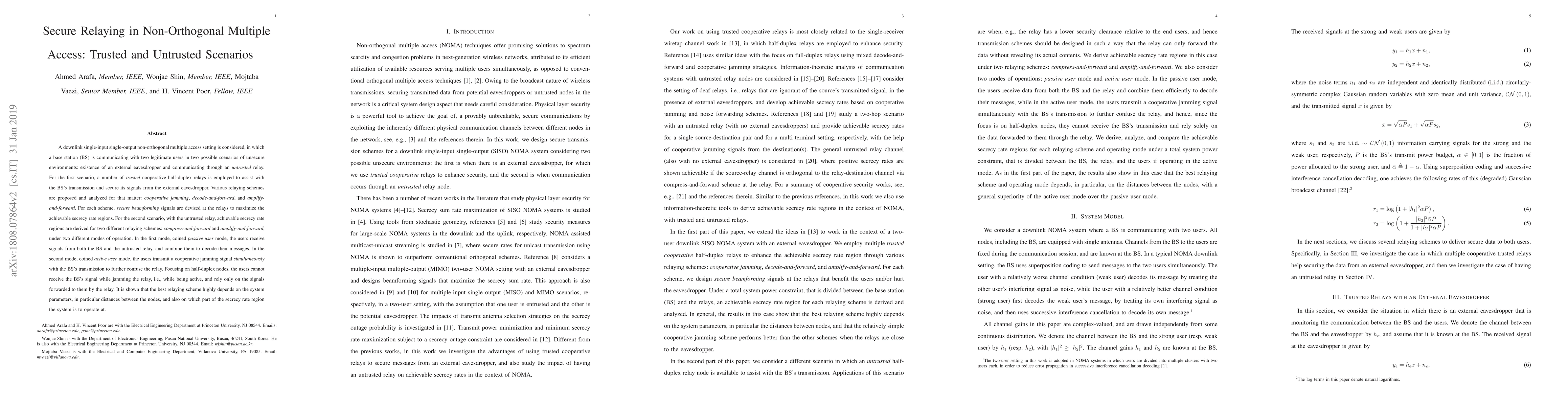 This paper explores secure relaying in non-orthogonal multiple access (NOMA) systems under two scenarios: employing trusted relays to secure transmissions against eavesdroppers and using untrusted relays. Various relaying schemes and secure beamforming strategies are analyzed to maximize secrecy rates.