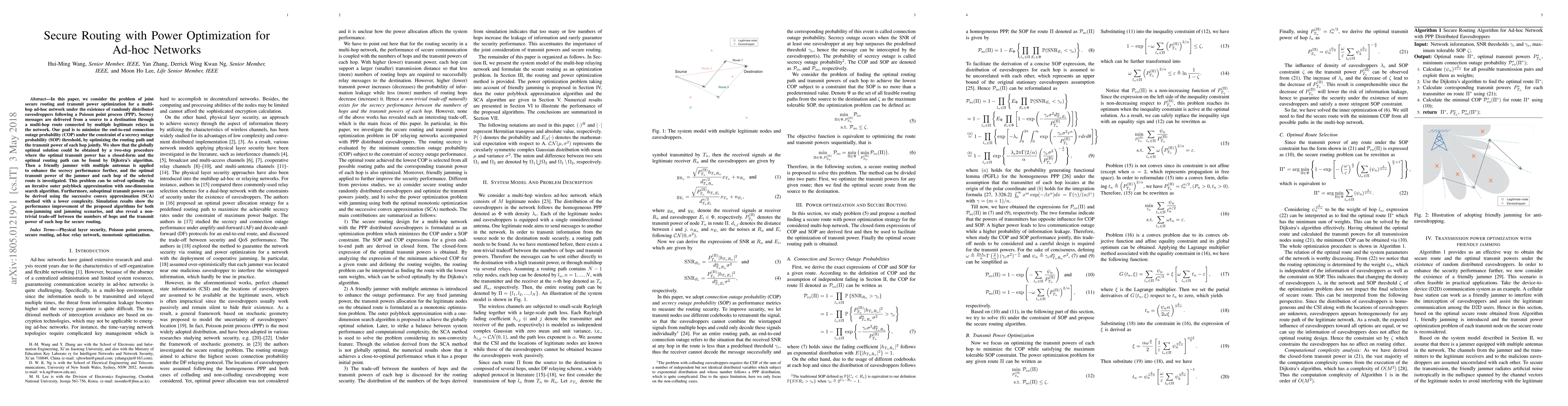 In this paper, we consider the problem of joint secure routing and transmit power optimization for a multi-hop ad-hoc network under the existence of randomly distributed eavesdroppers following a Poisson point process (PPP). Secrecy messages are delivered from a source to a destination through a multi-hop route connected by multiple legitimate relays in the network. Our goal is to minimize the end-to-end connection outage probability (COP) under the constraint of a secrecy outage probability (SOP) threshold, by optimizing the routing path and the transmit power of each hop jointly. We show that the globally optimal solution could be obtained by a two-step procedure where the optimal transmit power has a closed-form and the optimal routing path can be found by Dijkstra's algorithm. Then a friendly jammer with multiple antennas is applied to enhance the secrecy performance further, and the optimal transmit power of the jammer and each hop of the selected route is investigated. This problem can be solved optimally via an iterative outer polyblock approximation with one-dimension search algorithm. Furthermore, suboptimal transmit powers can be derived using the successive convex approximation (SCA) method with a lower complexity. Simulation results show the performance improvement of the proposed algorithms for both non-jamming and jamming scenarios, and also reveal a non-trivial trade-off between the numbers of hops and the transmit power of each hop for secure routing.