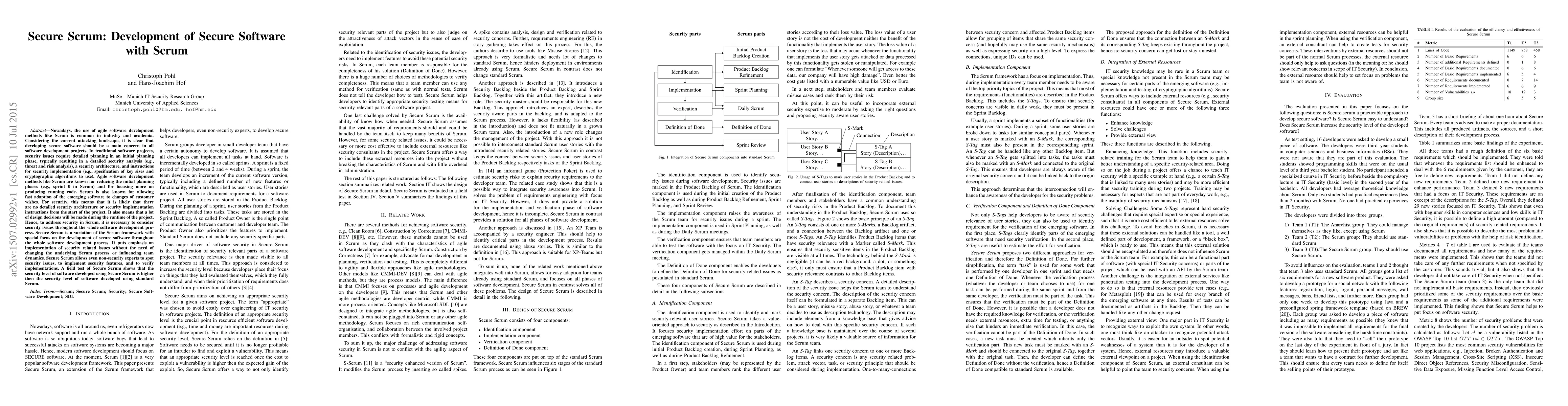 Secure Scrum is a variation of the Scrum framework designed to integrate security throughout the software development process without altering the core Scrum methodology. Field tests indicate that Secure Scrum enhances the security level of software compared to standard Scrum.