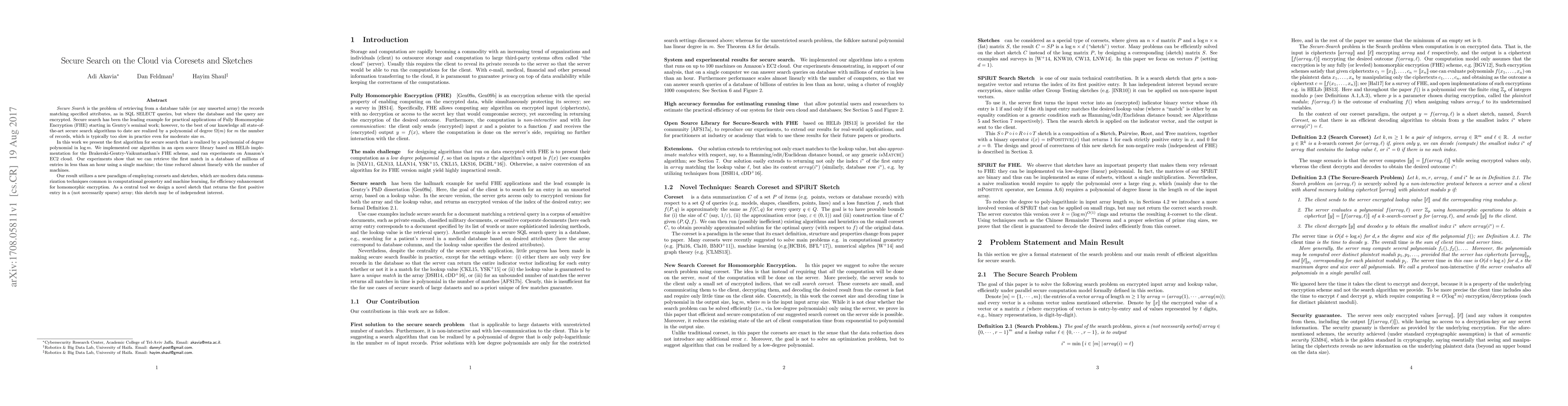 This paper introduces an efficient algorithm for secure search on encrypted cloud databases, achieving polynomial time complexity in $\log m$ rather than $m$, using coresets and sketches. Experiments demonstrate retrieval of the first match in large databases within an hour on a single machine, with near-linear time reduction with more machines.