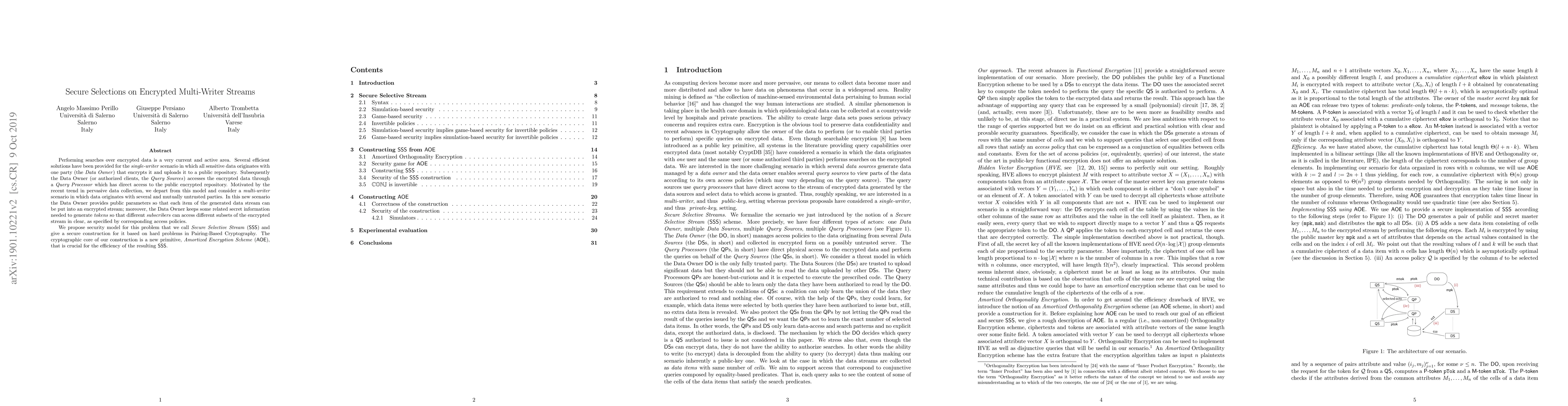 Performing searches over encrypted data is a very current and active area. Several efficient solutions have been provided for the single-writer scenario in which all sensitive data originates with one party (the Data Owner) that encrypts it and uploads it to a public repository. Subsequently the Data Owner (or authorized clients, the Query Sources) accesses the encrypted data through a Query Processor which has direct access to the public encrypted repository. Motivated by the recent trend in pervasive data collection, we depart from this model and consider a multi-writer scenario in which data originates with several and mutually untrusted parties. In this new scenario the Data Owner provides public parameters so that each item of the generated data stream can be put into an encrypted stream; moreover, the Data Owner keeps some related secret information needed to generate tokens so that different subscribers can access different subsets of the encrypted stream in clear, as specified by corresponding access policies. We propose a new public-key scheme, Secure Selective Stream (SSS), built upon an Amortized Encryption Scheme (AOE), that can be used to encrypt each item in the stream so that the ciphertexts have size proportional to the un-encrypted data; moreover, encryption and decryption take time linear in the data item size. We provide constructions for SSS and AOE. We provide a game-based and an indistinguishability-based security notions for SSS, we prove that the SSS scheme is game-base secure given that the AOE scheme is game-based secure as well. We prove that AOE is secure under hardness assumptions in the bilinear setting. We provide an implementation in C++ all the basic operations in our multi-writer scenario using one round of communication.