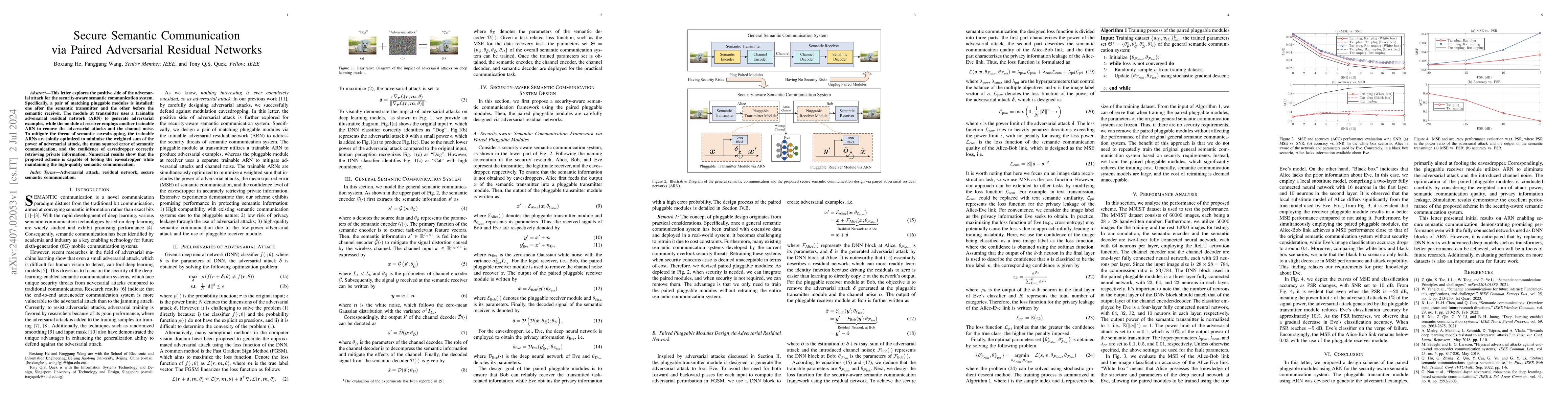 This paper proposes a security-aware semantic communication system using paired adversarial residual networks to generate and remove adversarial examples, effectively mitigating eavesdropping threats while preserving communication quality.