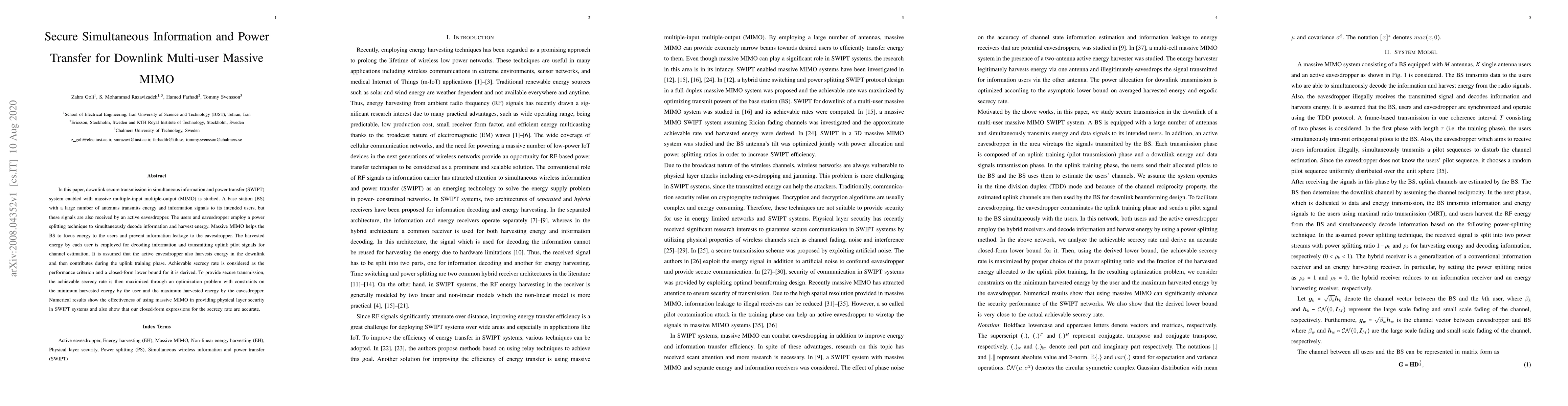 This paper investigates secure downlink transmission in a massive MIMO system with simultaneous information and power transfer (SWIPT), focusing on preventing information leakage to an active eavesdropper. It employs an optimization problem to maximize achievable secrecy rate, demonstrating the effectiveness of massive MIMO for physical layer security and validating the accuracy of derived closed-form expressions for secrecy rate.