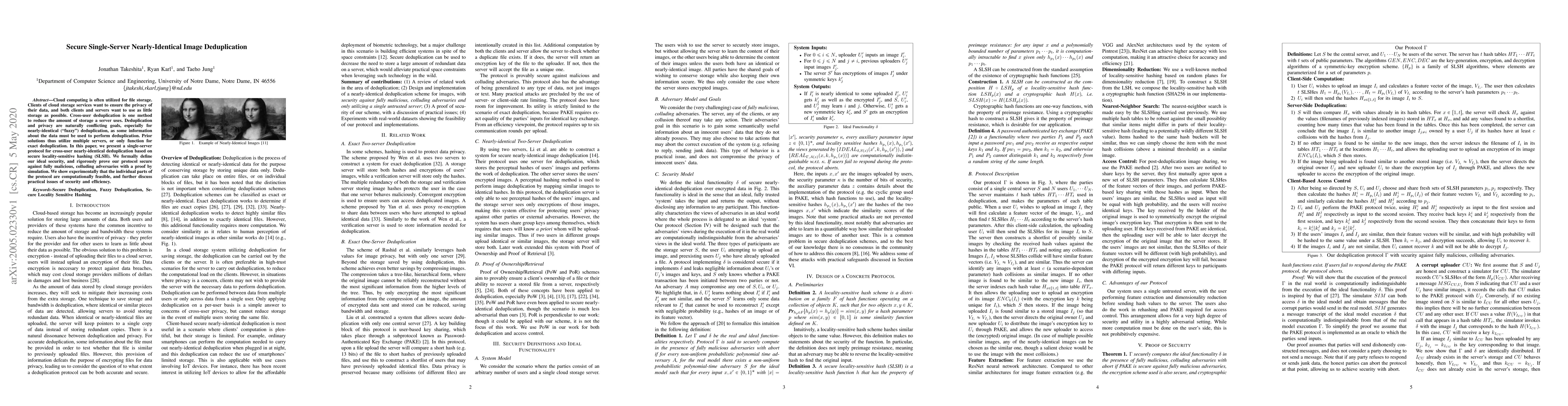 This paper proposes a secure single-server protocol for nearly-identical image deduplication using secure locality-sensitive hashing (SLSH). It rigorously proves the protocol's security against malicious adversaries and demonstrates computational feasibility experimentally.