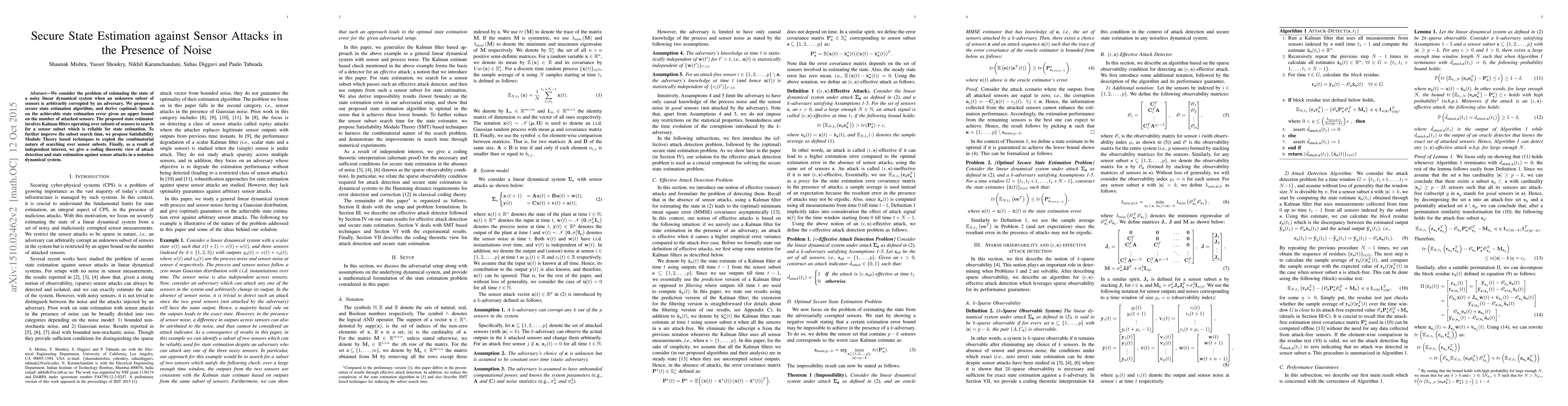 We consider the problem of estimating the state of a noisy linear dynamical system when an unknown subset of sensors is arbitrarily corrupted by an adversary. We propose a secure state estimation algorithm, and derive (optimal) bounds on the achievable state estimation error given an upper bound on the number of attacked sensors. The proposed state estimator involves Kalman filters operating over subsets of sensors to search for a sensor subset which is reliable for state estimation. To further improve the subset search time, we propose Satisfiability Modulo Theory based techniques to exploit the combinatorial nature of searching over sensor subsets. Finally, as a result of independent interest, we give a coding theoretic view of attack detection and state estimation against sensor attacks in a noiseless dynamical system.