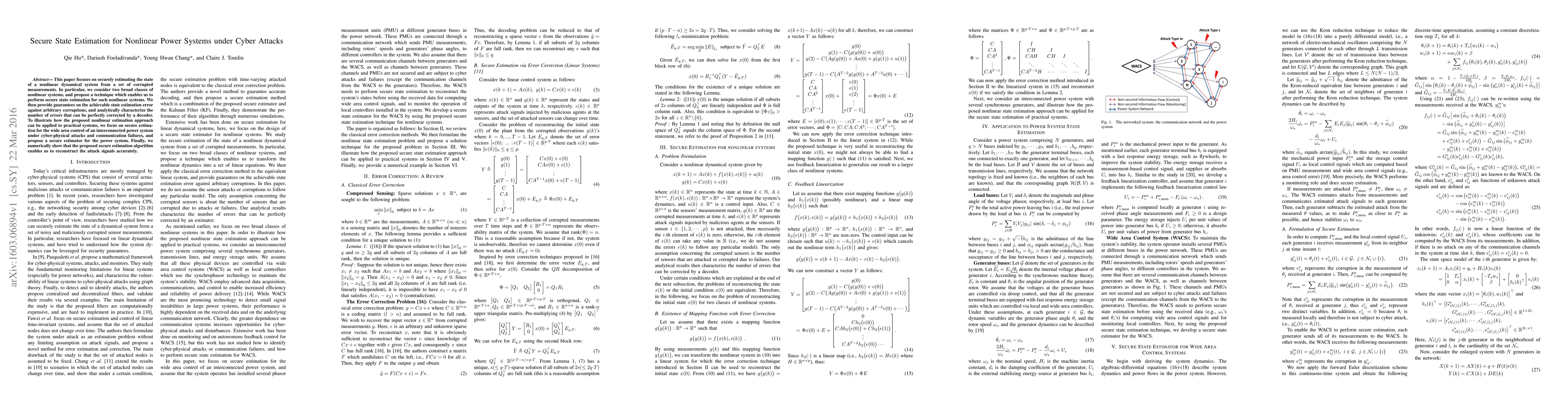 This paper proposes a secure state estimation technique for nonlinear dynamical systems, particularly for power systems, under cyber attacks. The method guarantees state estimation accuracy despite corrupted measurements and communication failures, and effectively reconstructs attack signals.