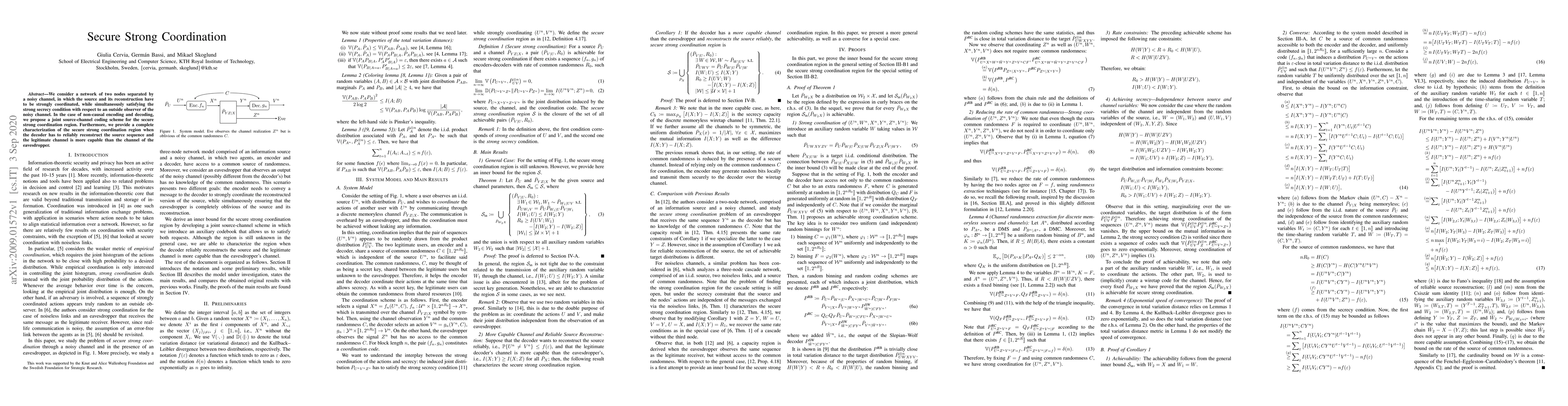 This research introduces a secure strong coordination scheme for a two-node network with a noisy channel, ensuring both source-reconstruction reliability and strong secrecy from an external observer. It proposes a joint source-channel coding method for non-causal encoding and decoding, and fully characterizes the secure strong coordination region when the decoder must accurately reconstruct the source sequence and the legitimate channel outperforms the eavesdropper's channel.